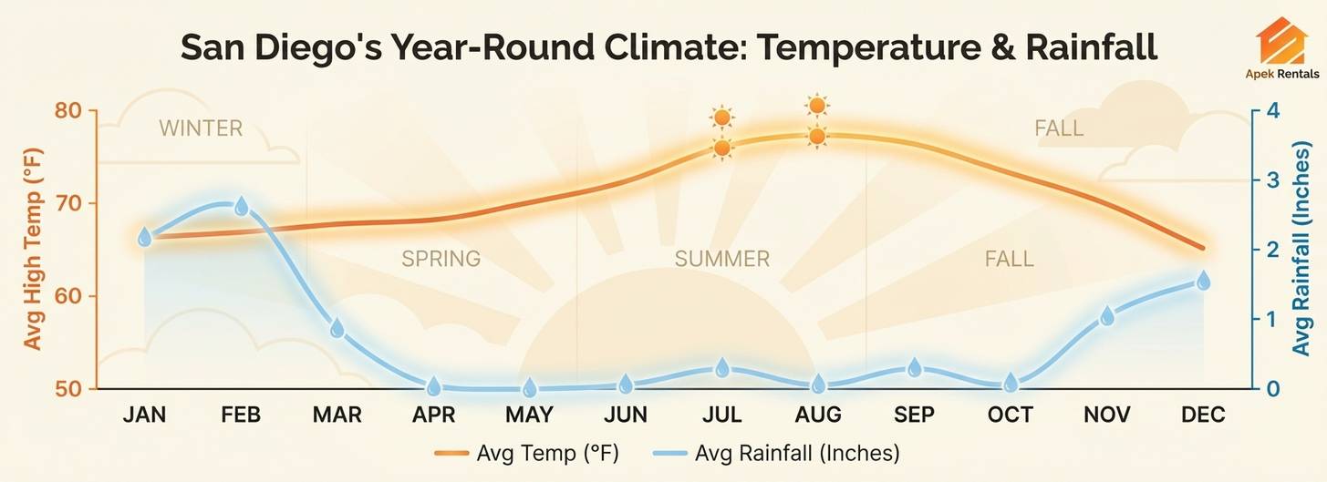 Winter is also our rainy season. However, San Diego only gets about 10 inches of rain a year. You will still see plenty of sunshine.