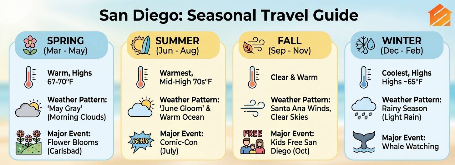San Diego offers something special in every season. Spring brings blooming flowers. Summer offers perfect beach days. Fall gives you clear skies and fewer crowds. Winter provides quiet beauty and amazing whale watching. The best time to visit San Diego truly depends on what you want to do.