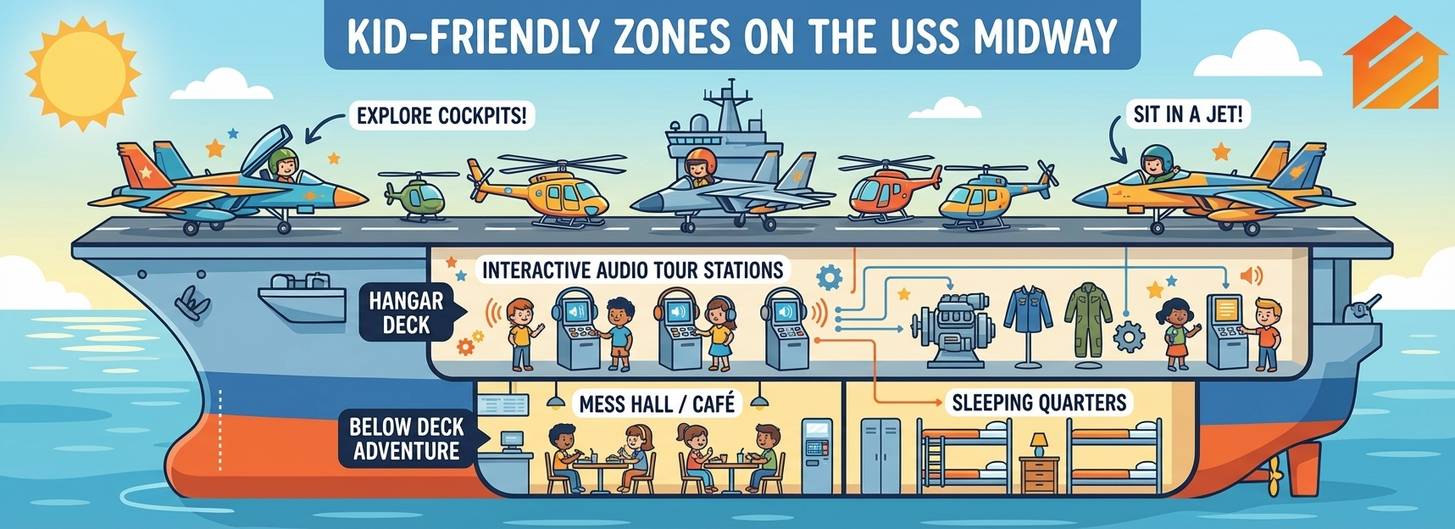 The USS Midway is a real aircraft carrier floating in the San Diego Bay. It is massive and packed with real fighter jets that kids can look at up close.