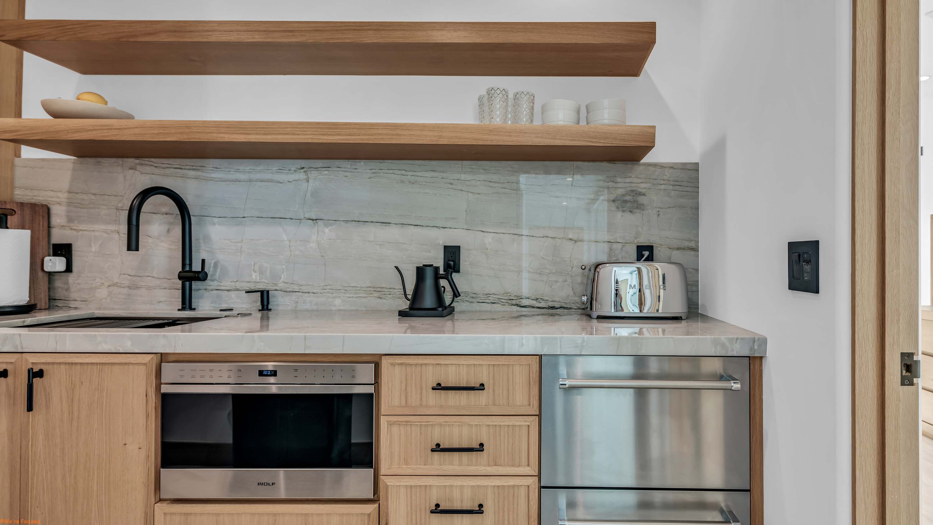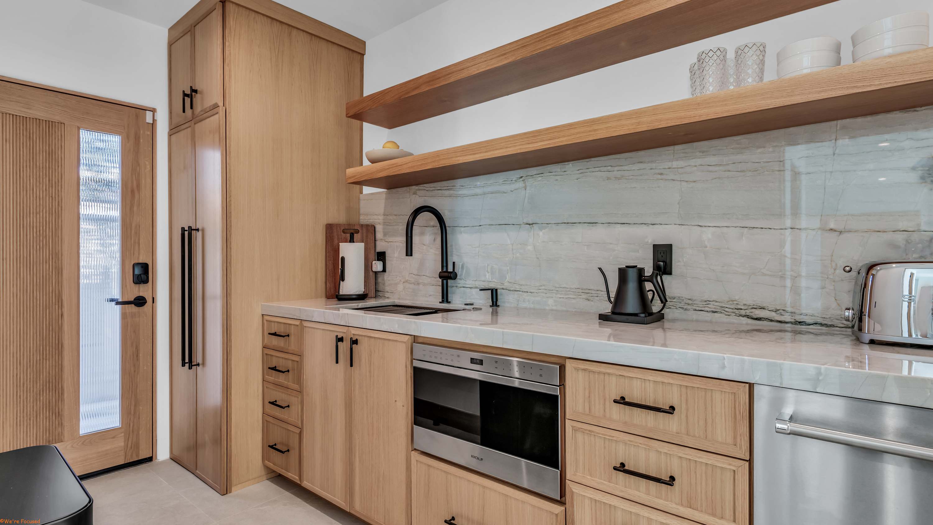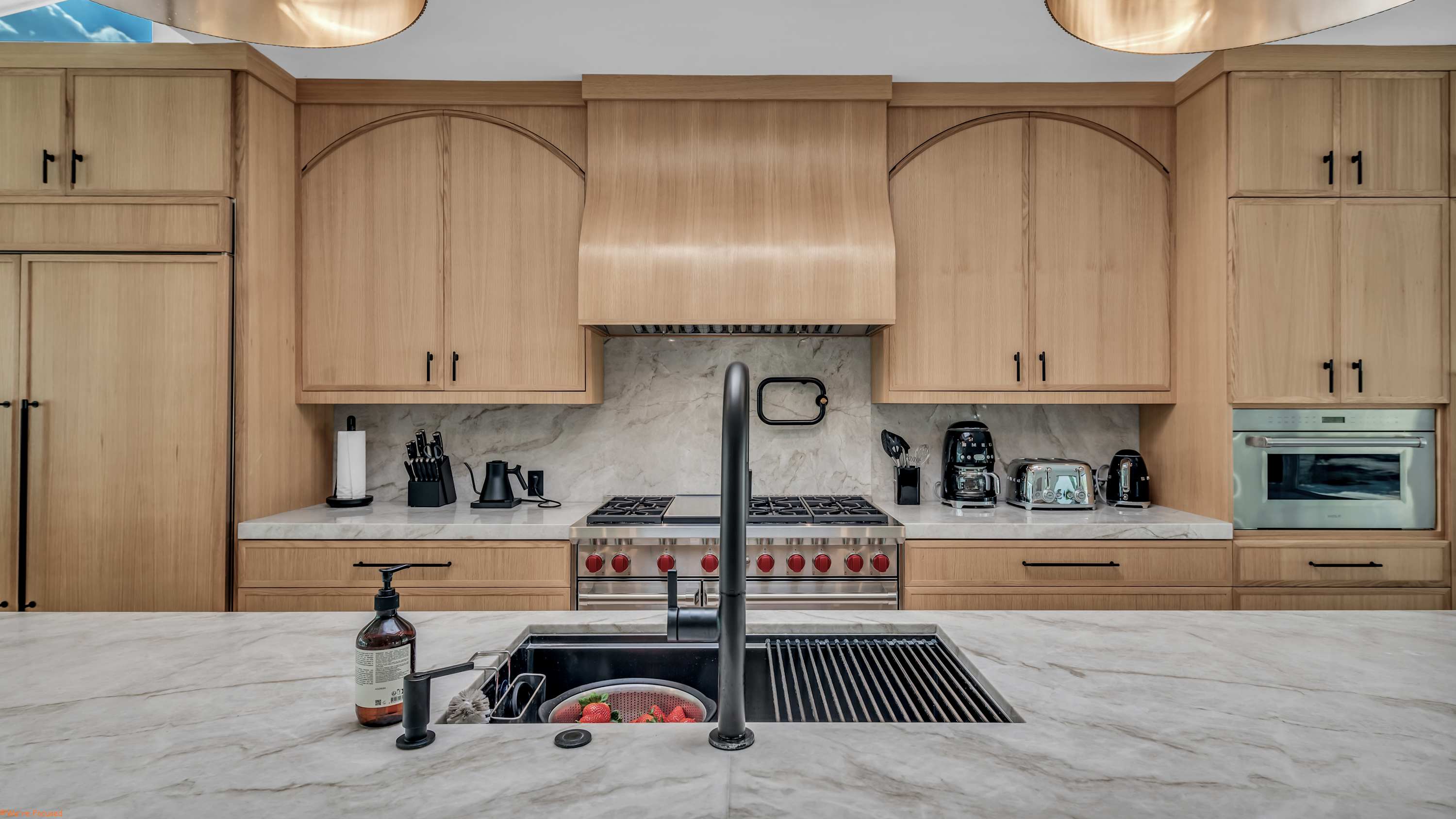 Fully equipped chef’s kitchen with stove, oven, refrigerator, and dishwasher.