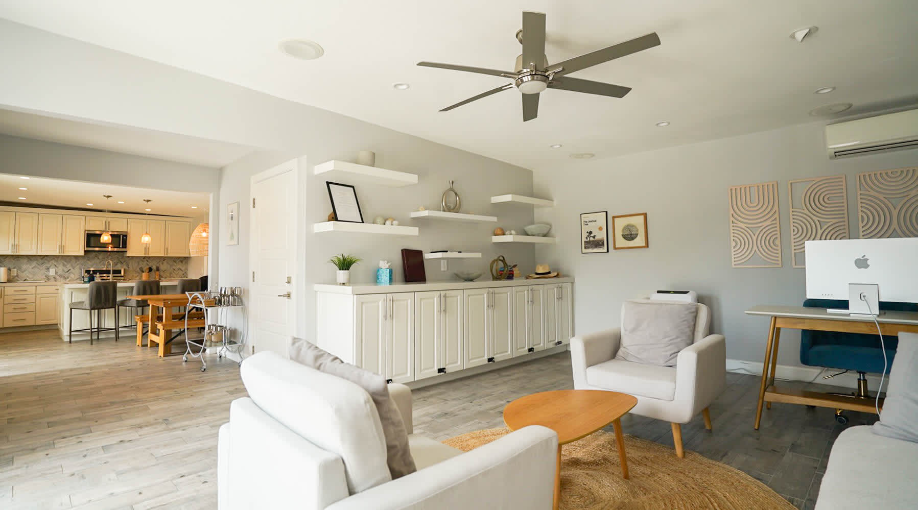 * Features a full-sized, fully equipped kitchen and a spacious living area.