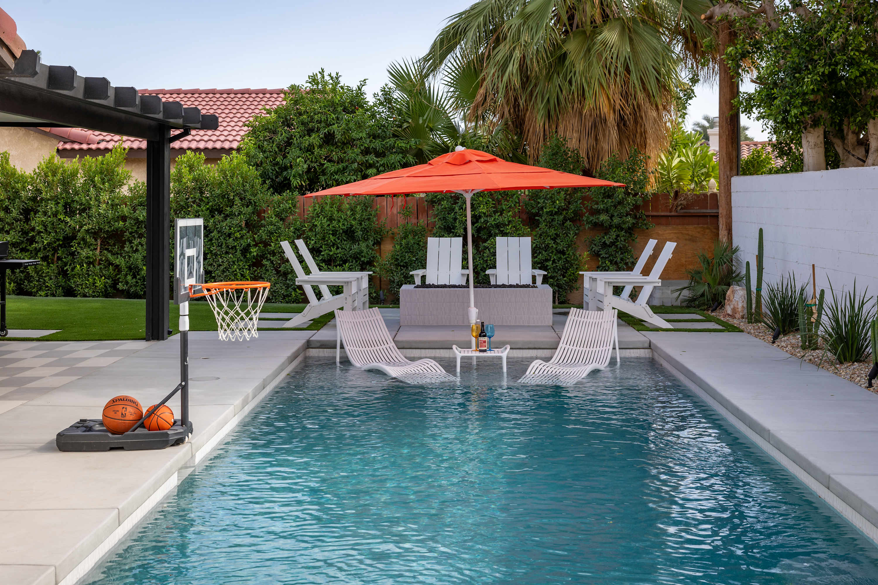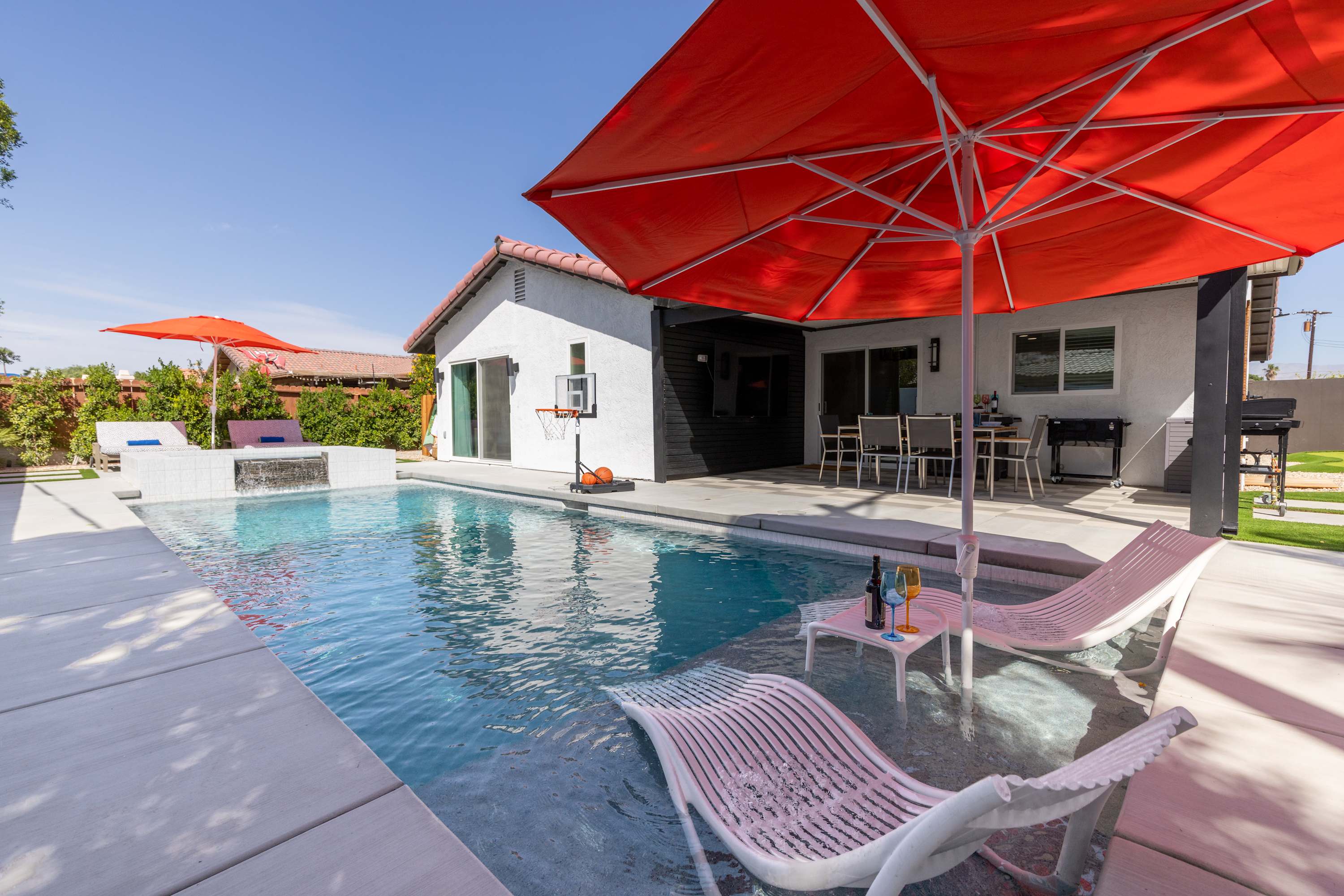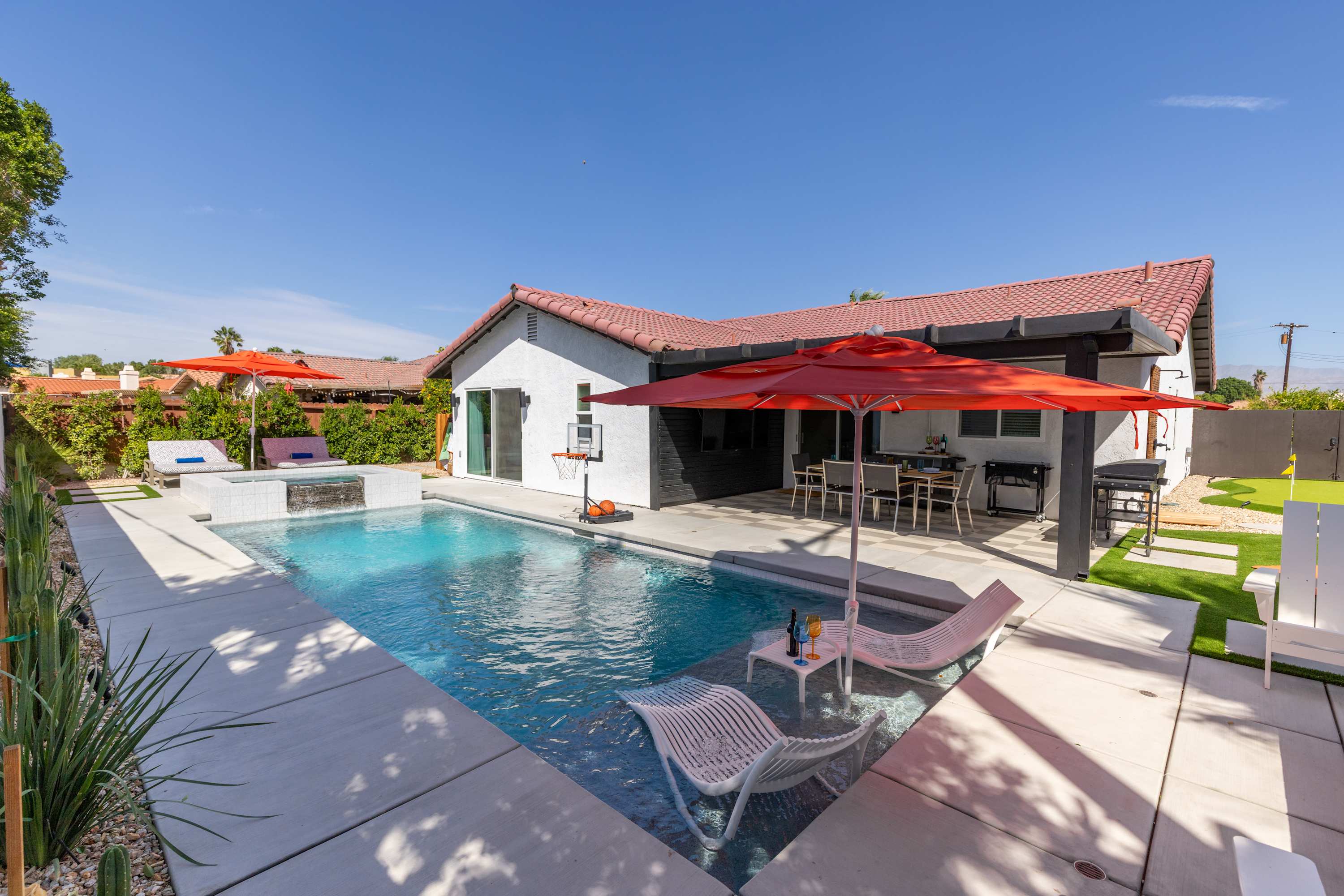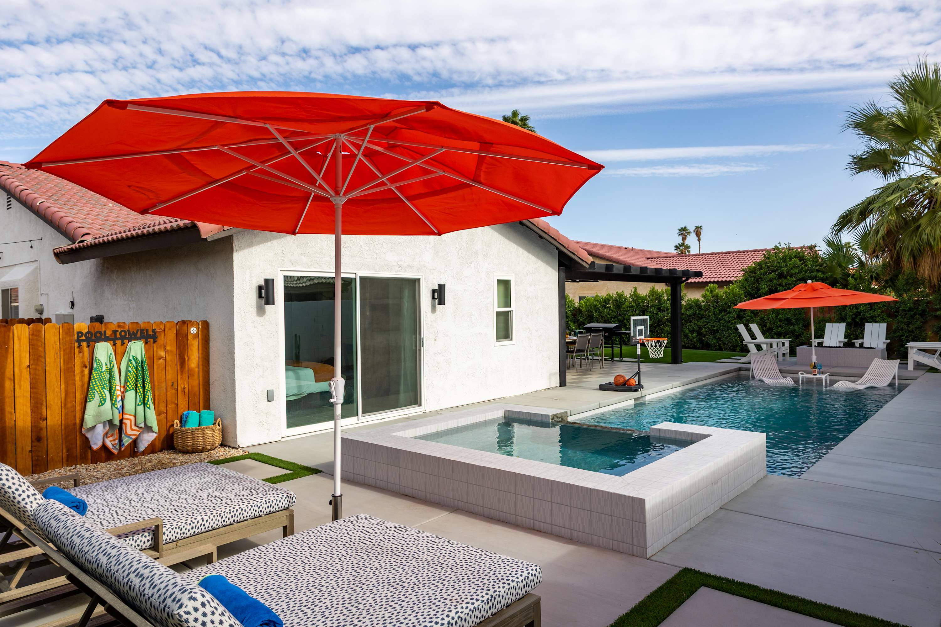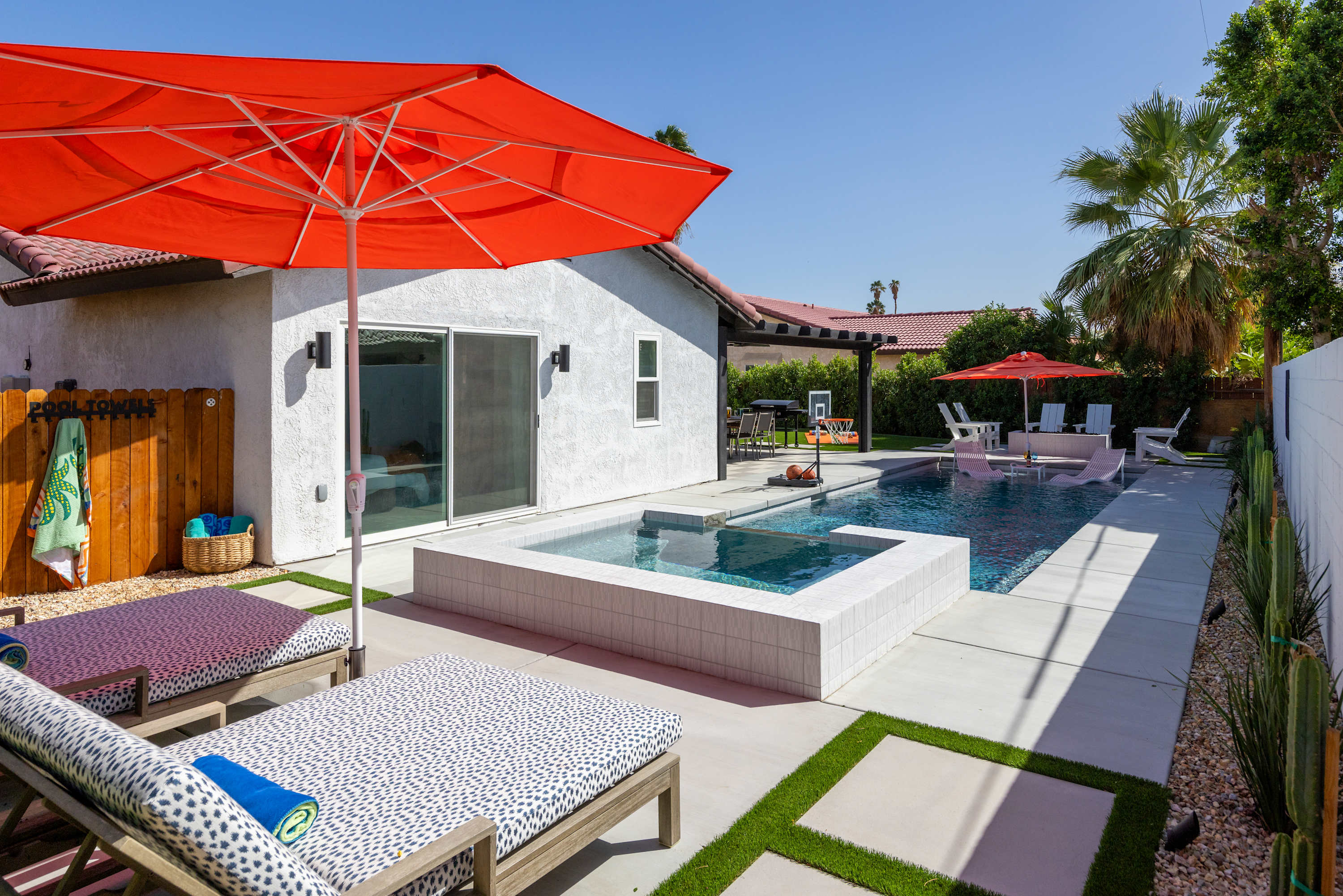💦 Heated Saltwater Pool & Hot Tub – Pool heating available for $100/day and complimentary spa heating. The pool features an L-shaped bench with umbrella slots, balancing sun and shade beautifully.