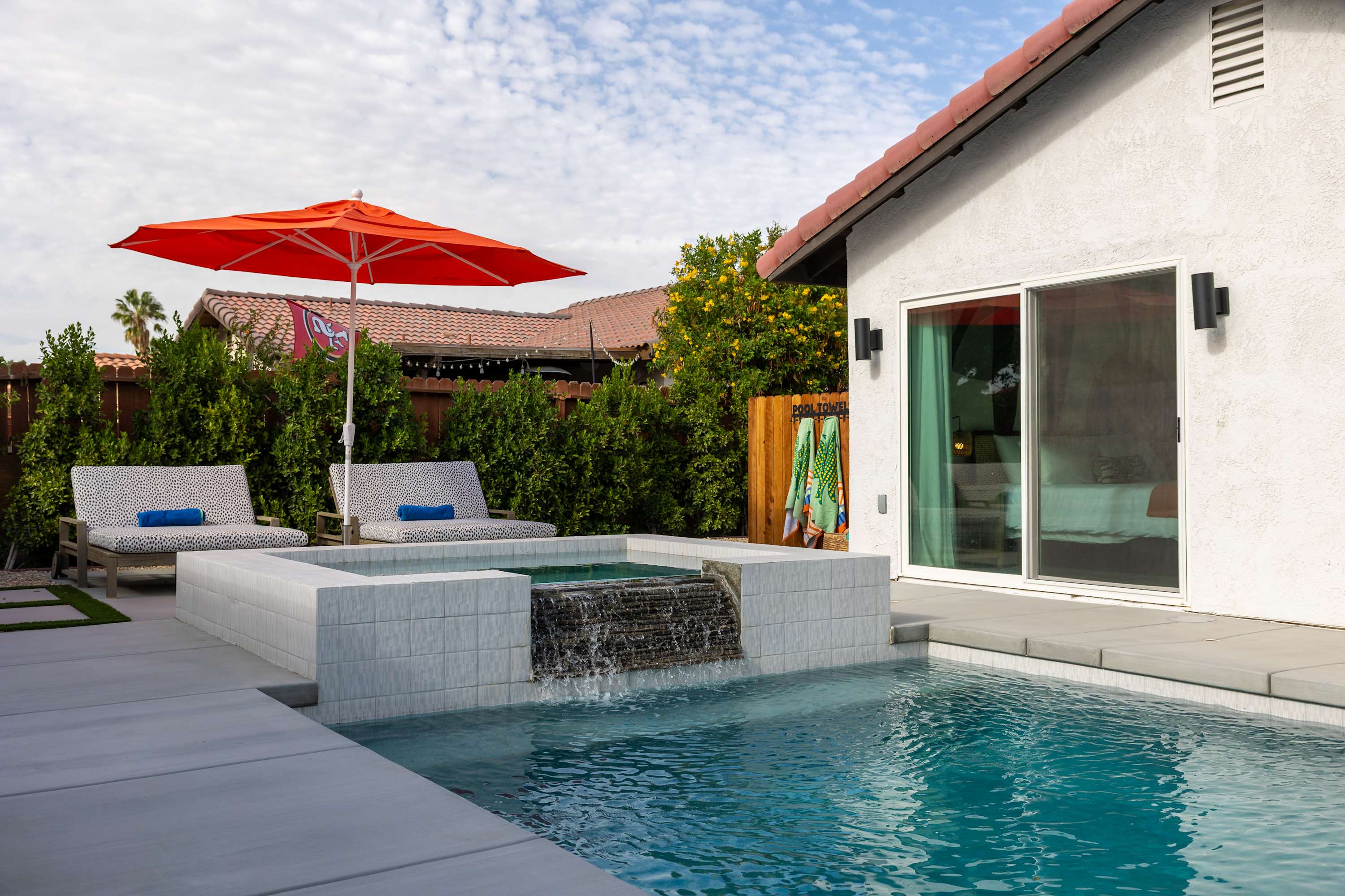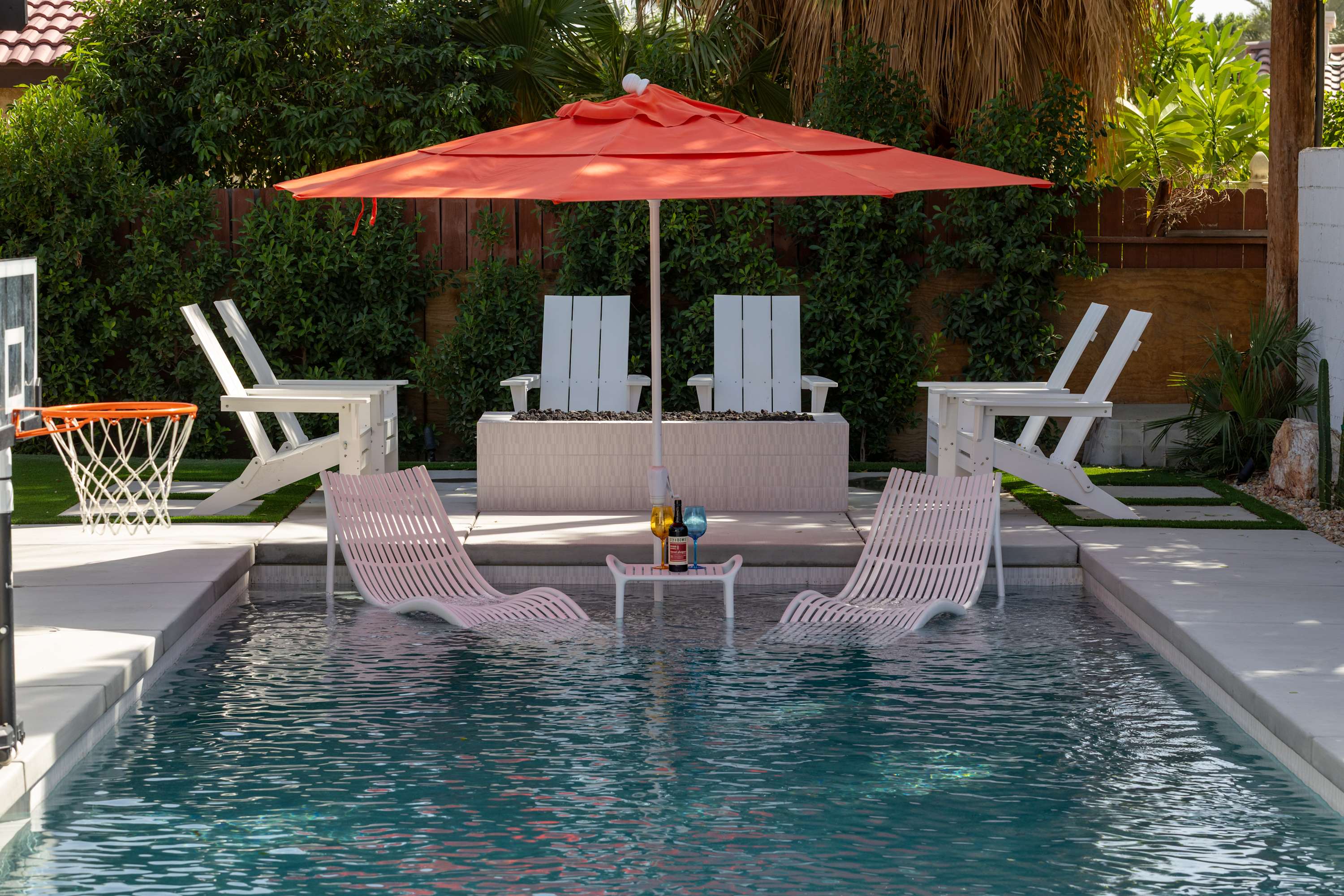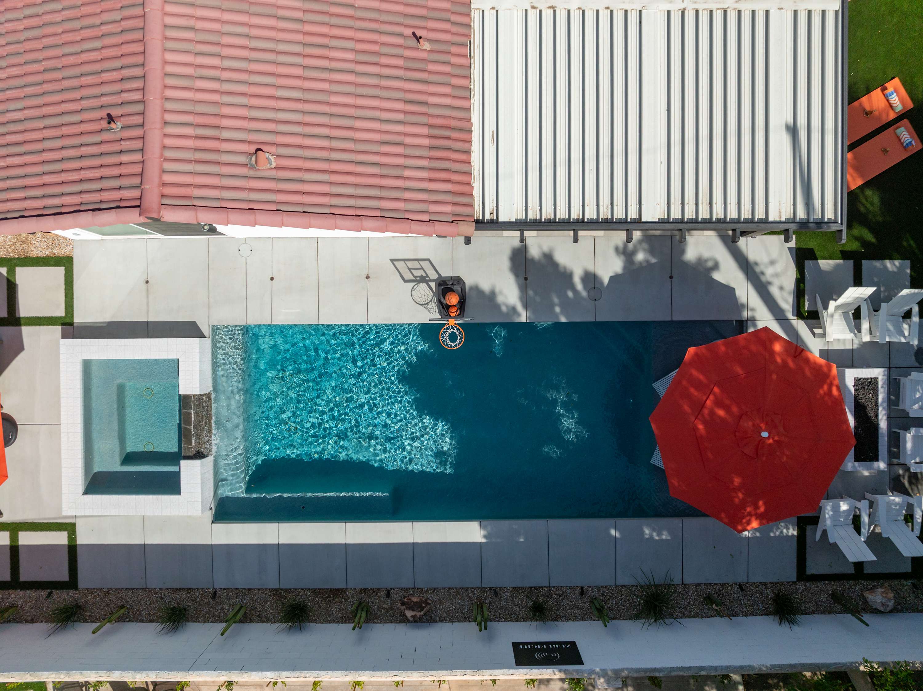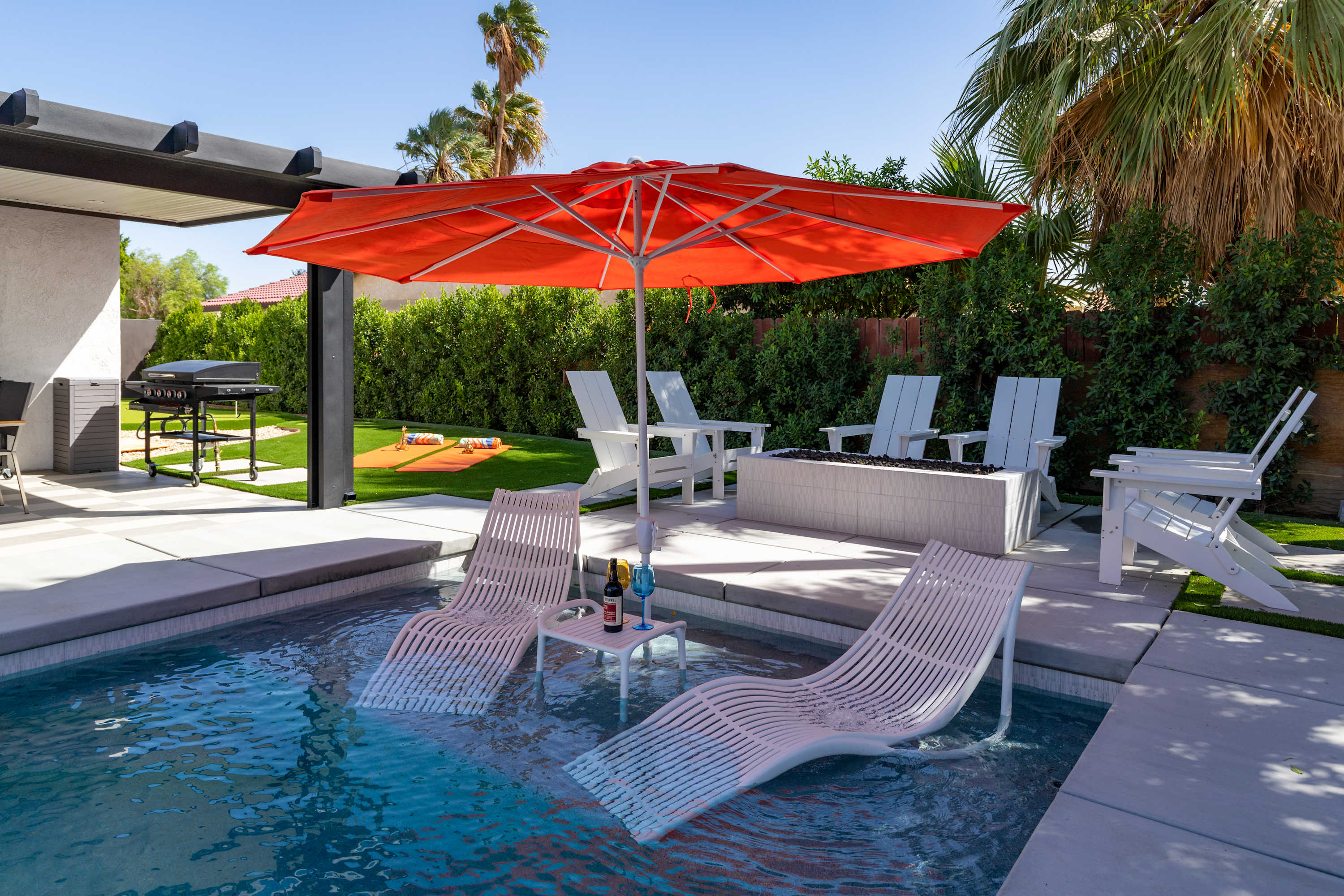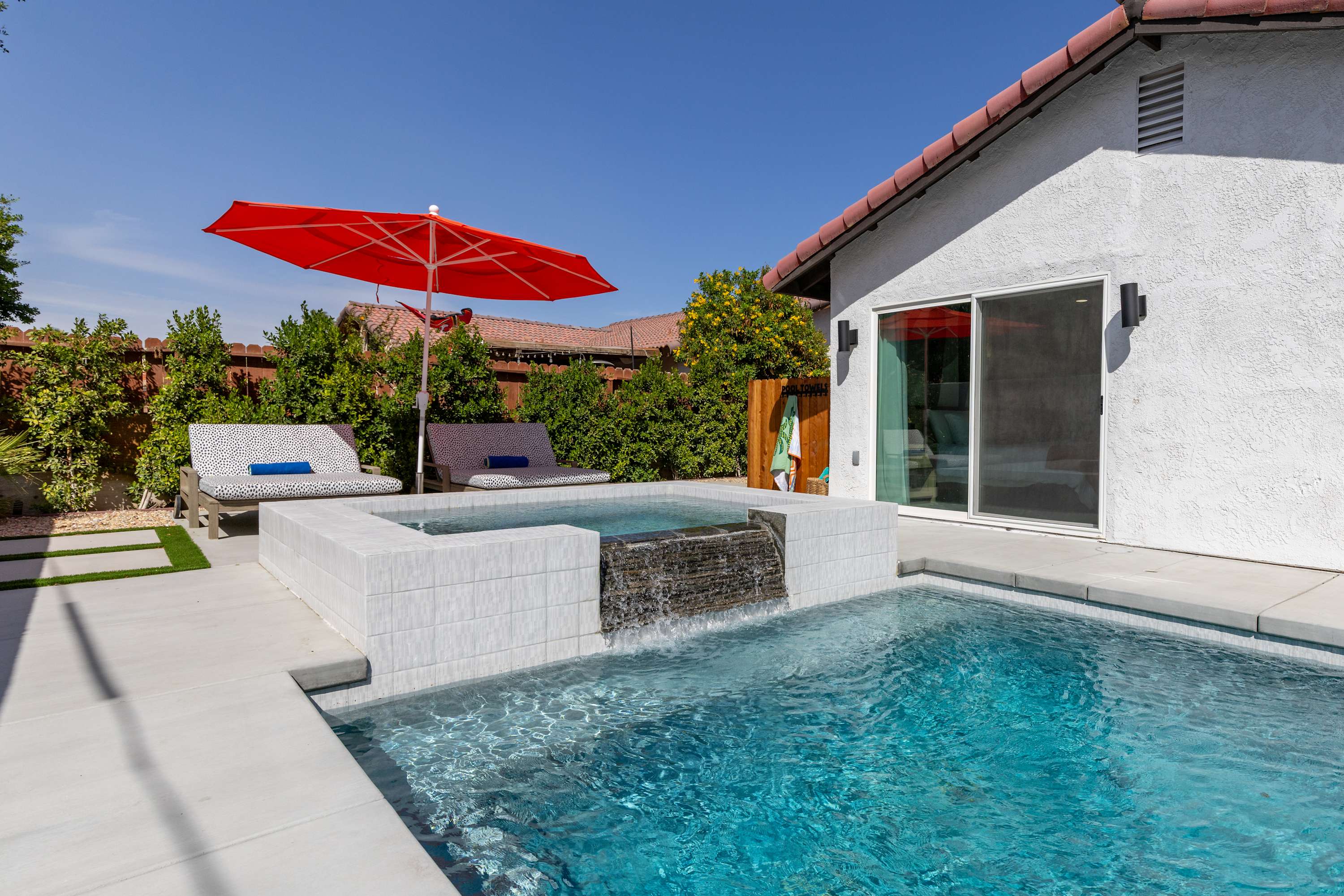💦 Heated Saltwater Pool & Hot Tub – Pool heating available for $100/day and complimentary spa heating. The pool features an L-shaped bench with umbrella slots, balancing sun and shade beautifully.