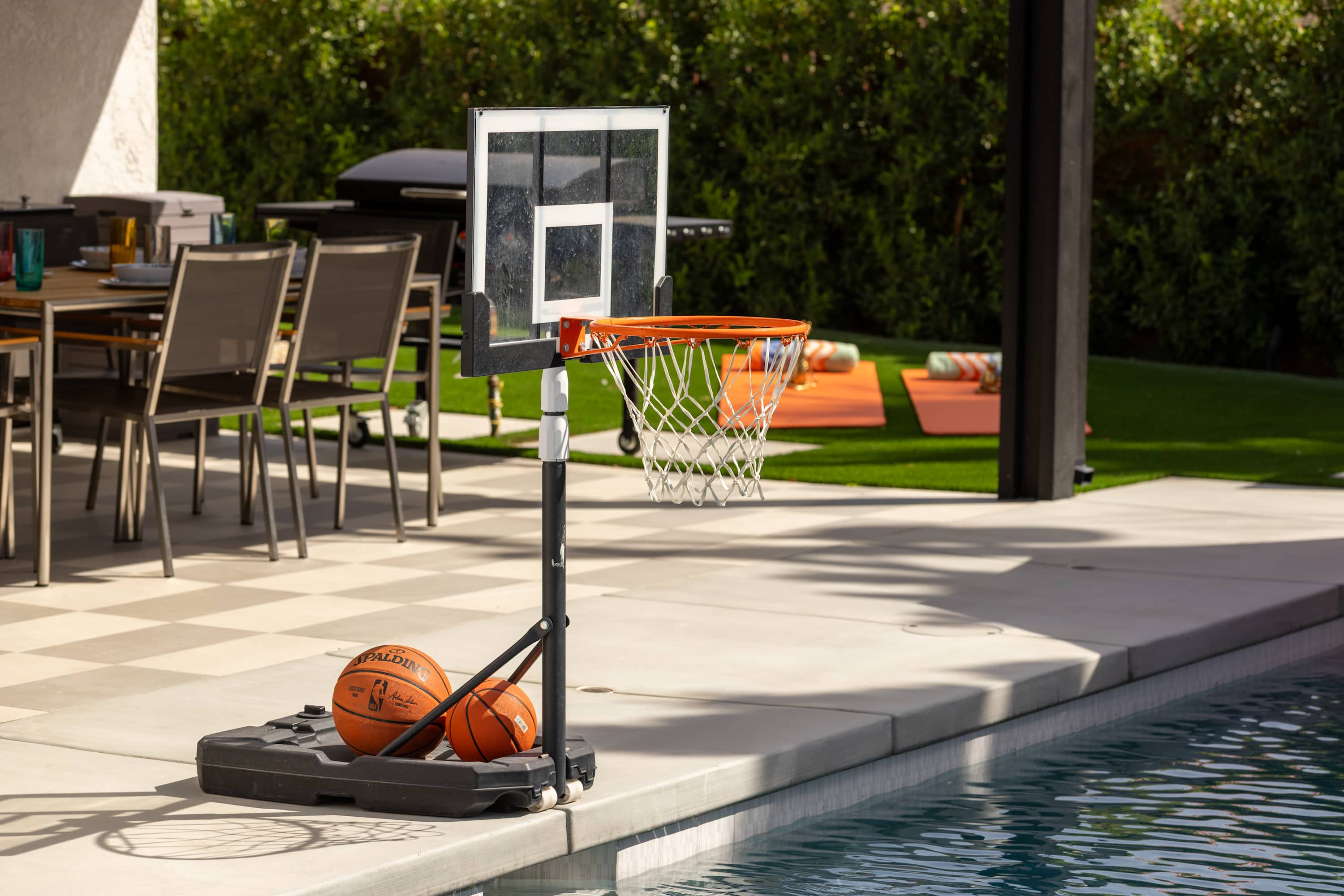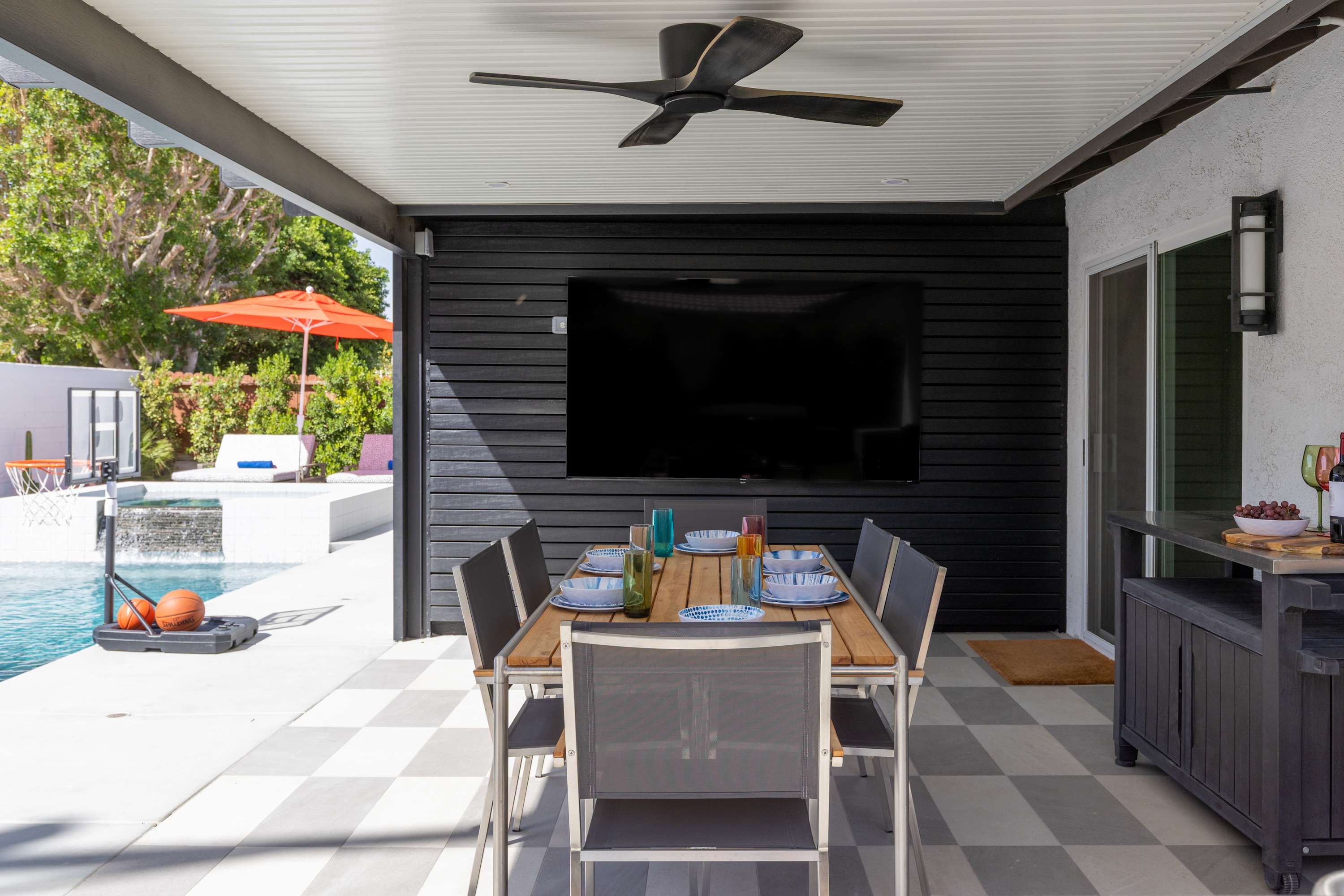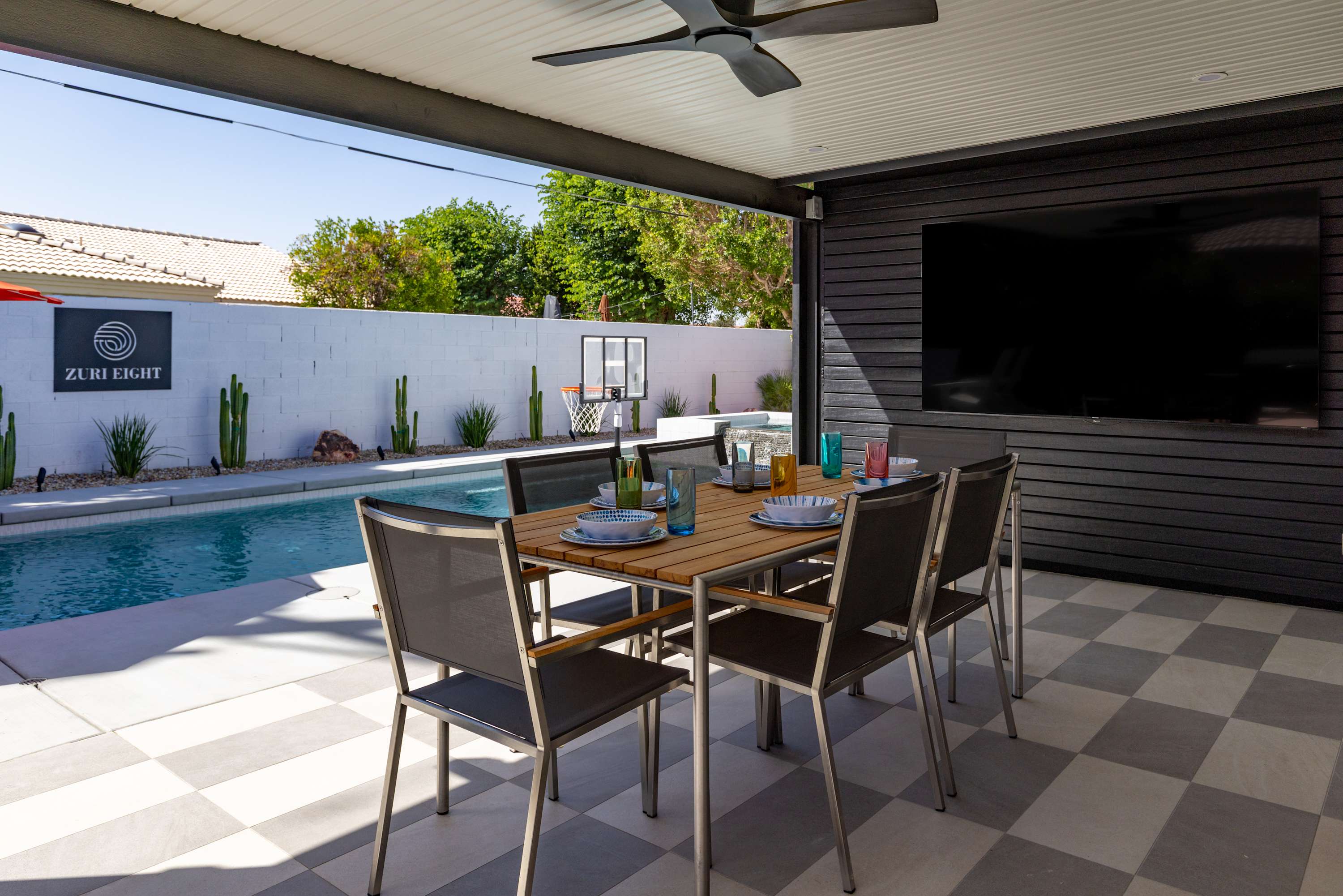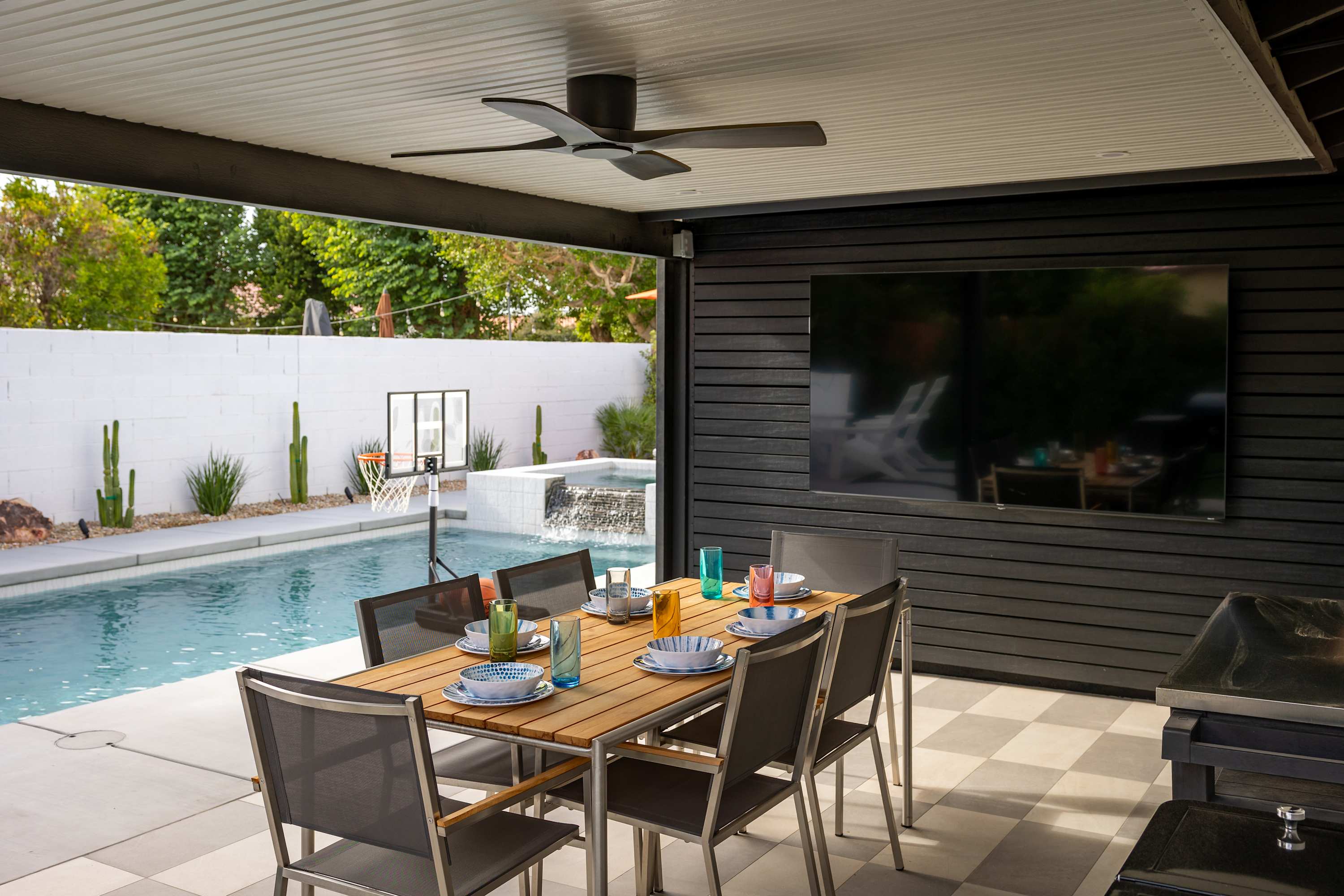 🎬 Poolside Movie Experience – Swivel the 85” outdoor TV toward the pool, float beneath the stars, and enjoy your favorite movie or game on the big screen.