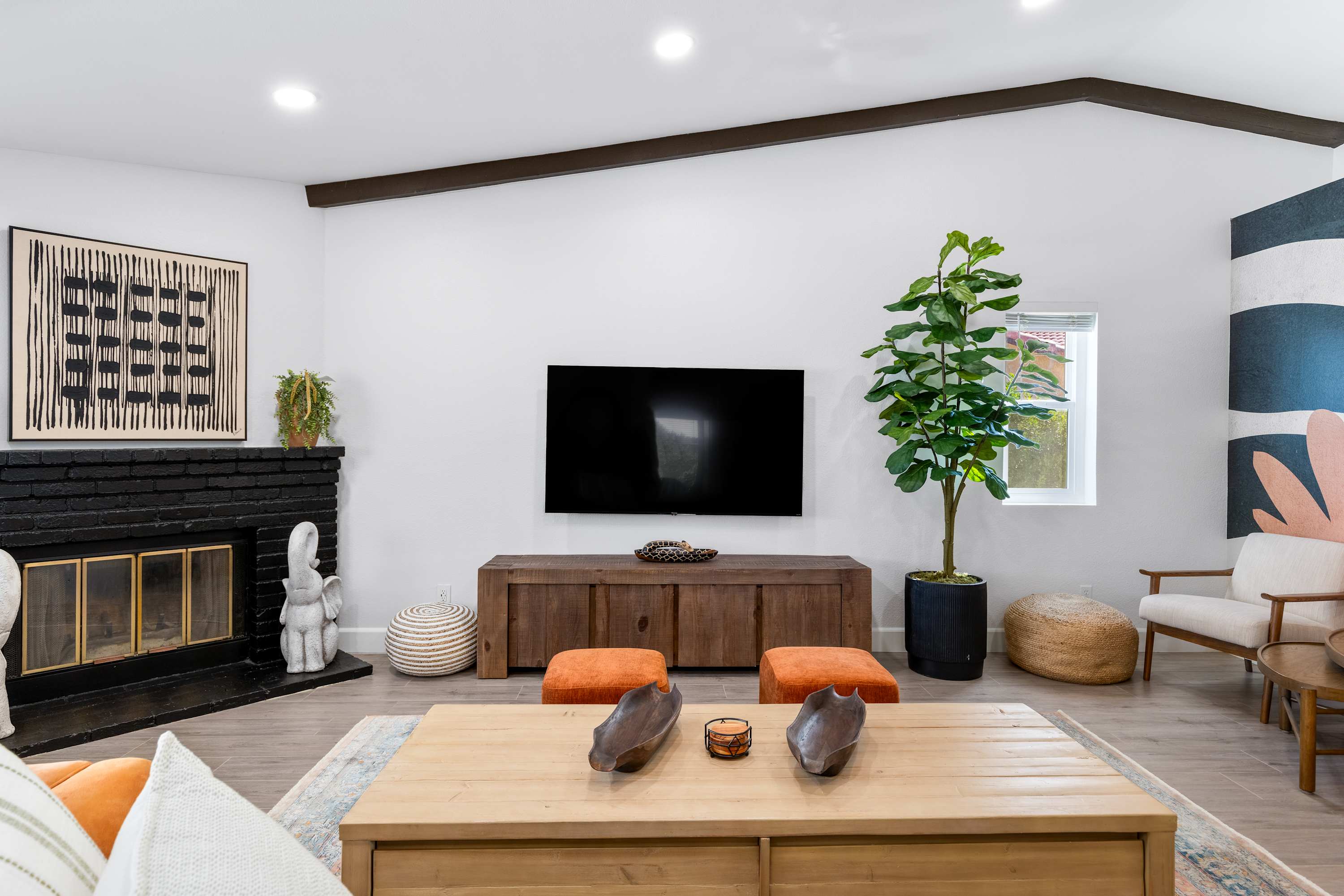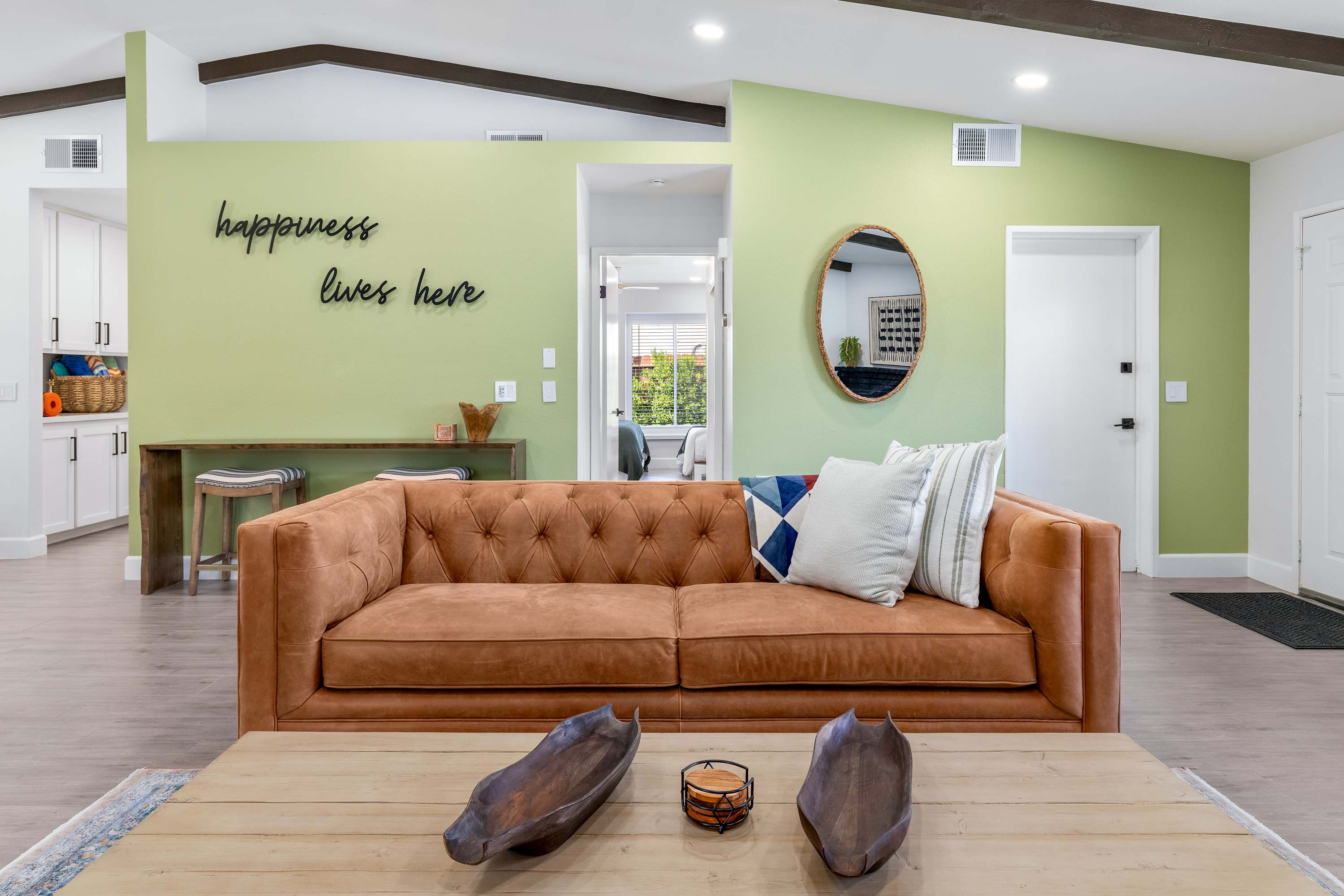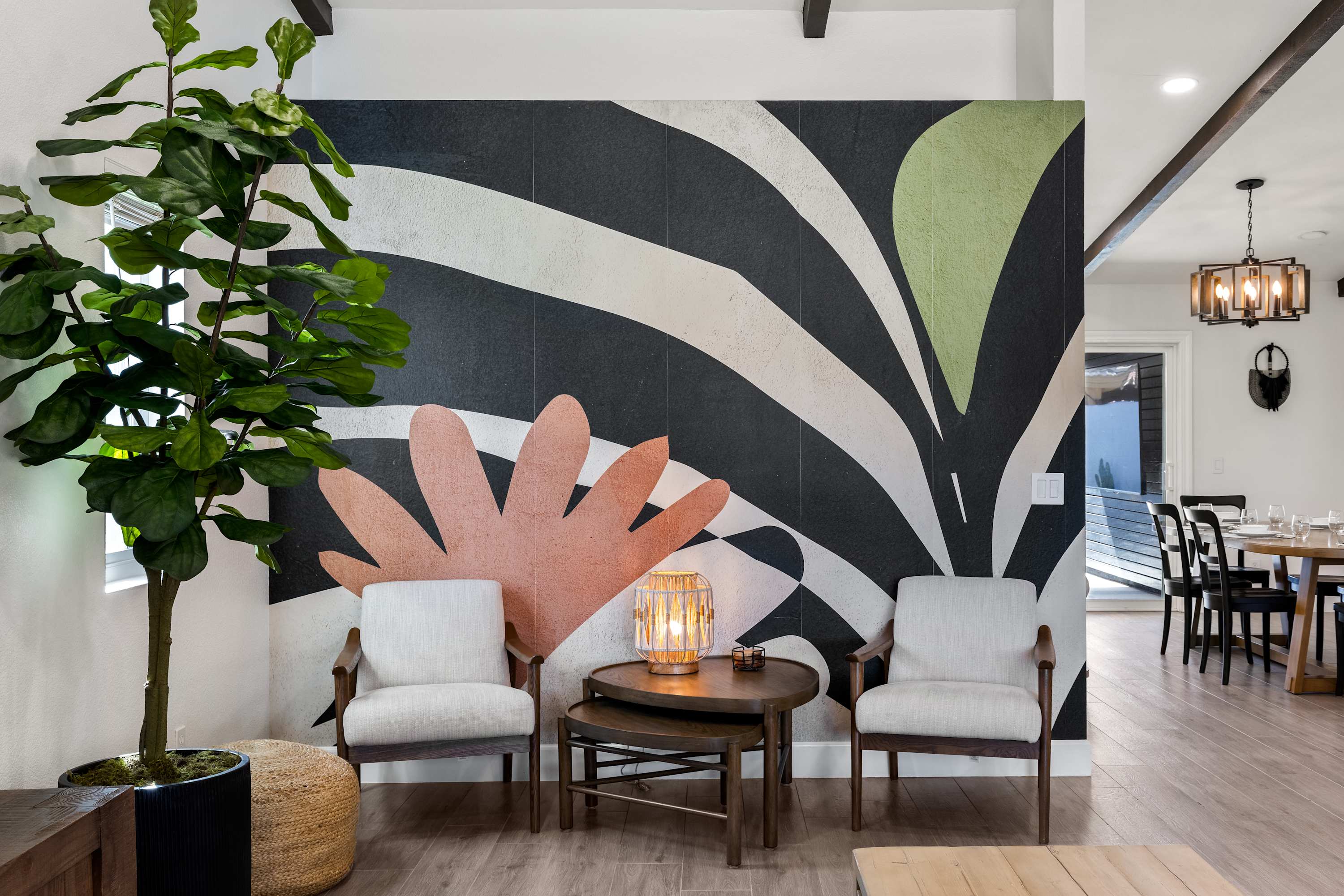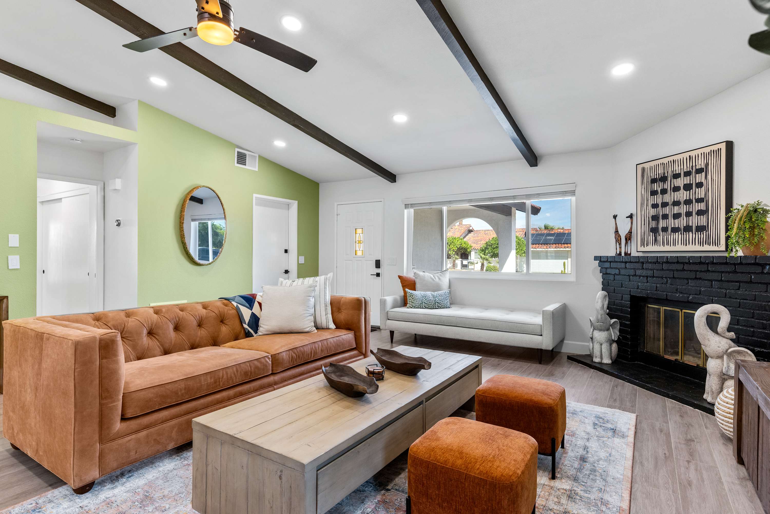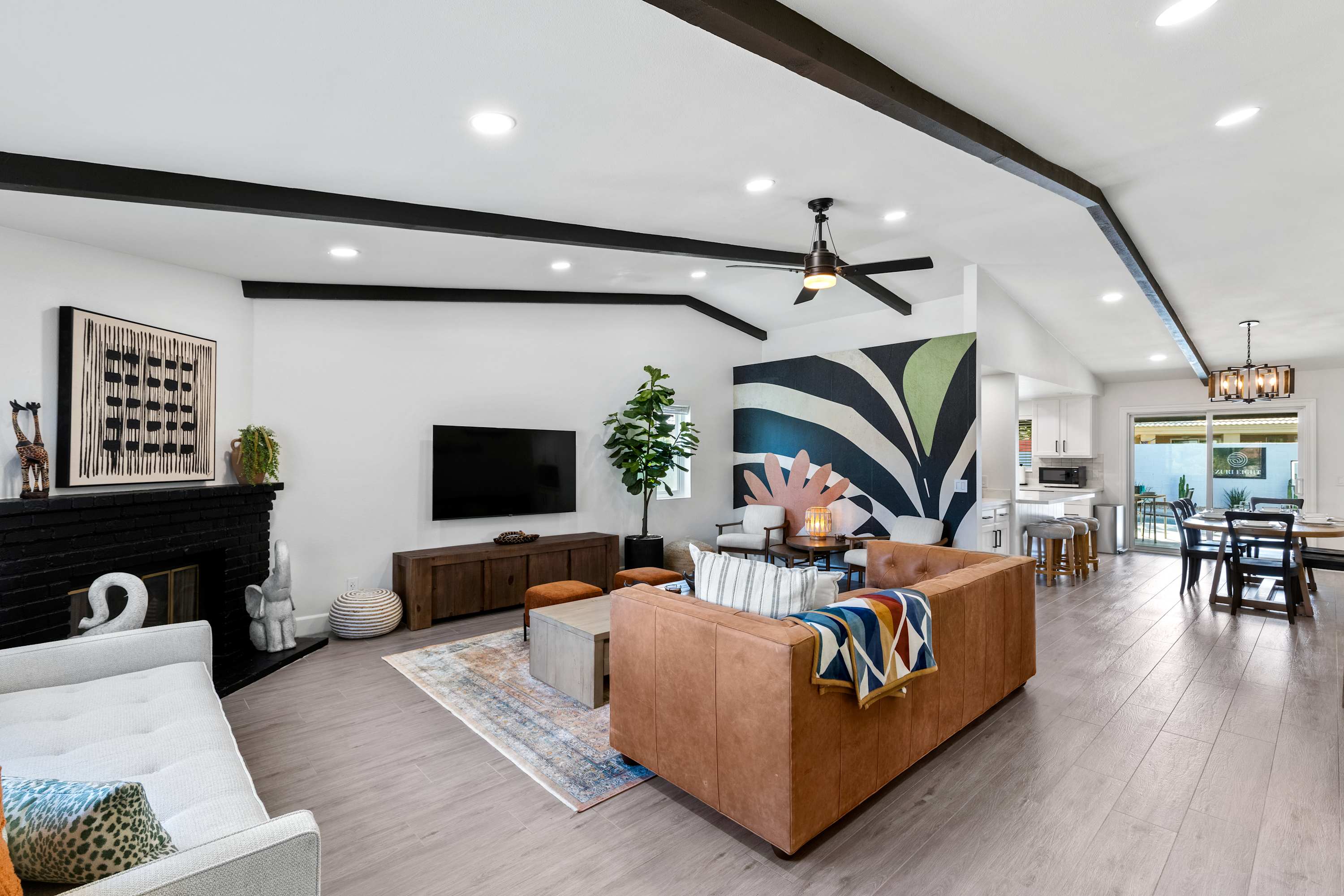 🛋 Living Room: Step into an ambiance like no other. With soaring beamed ceilings, vibrant Afrohemian wallpaper, and the soft glow of desert light, this space radiates warmth and style. Sink into the leather couch or daybed, gather by the fireplace, or share laughs over a favorite board game. The Smart TV welcomes you upon arrival and connects you to everything the desert offers — from in-home massages and private chefs to local adventures designed to elevate your stay. This is where comfort, culture, and connection meet.