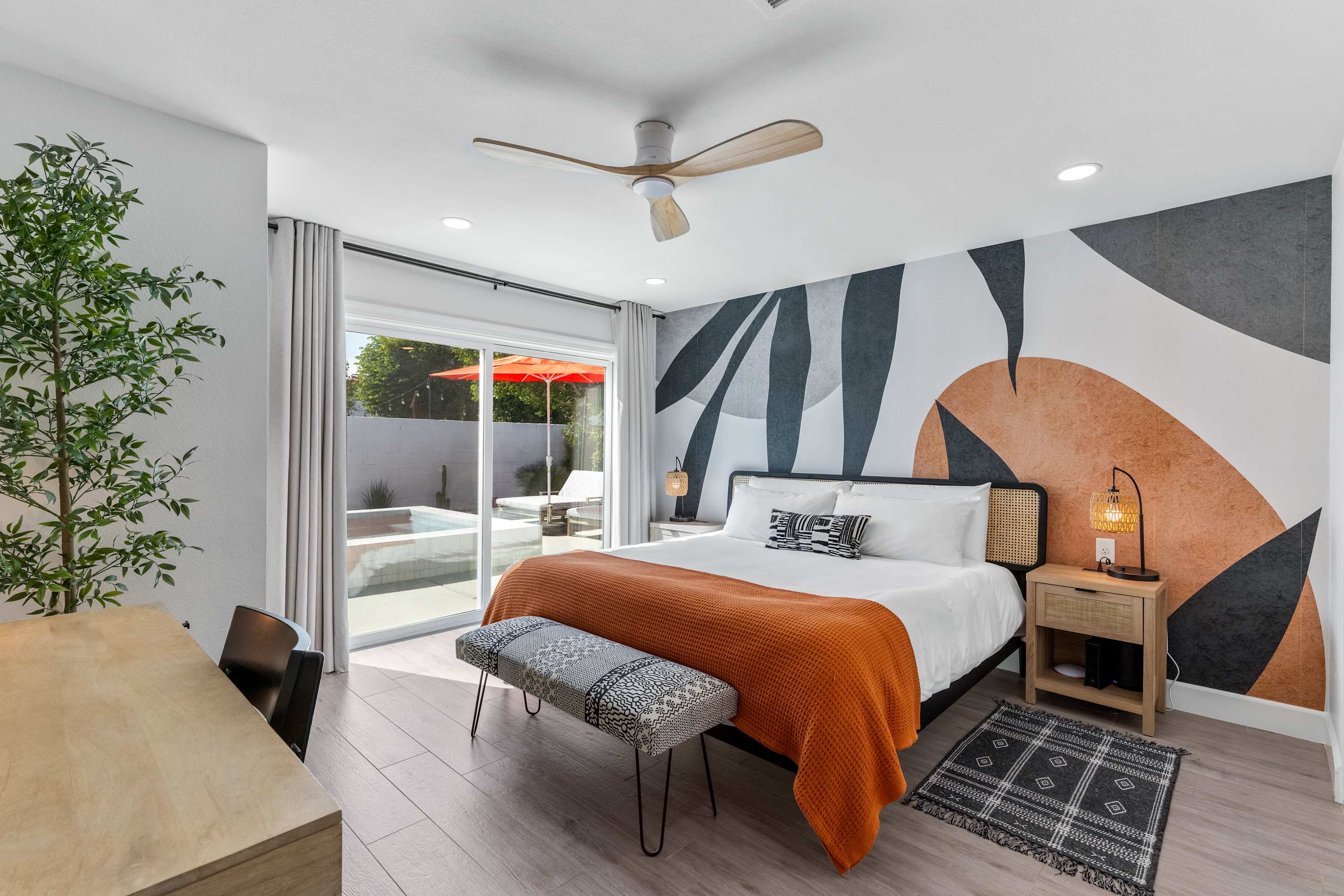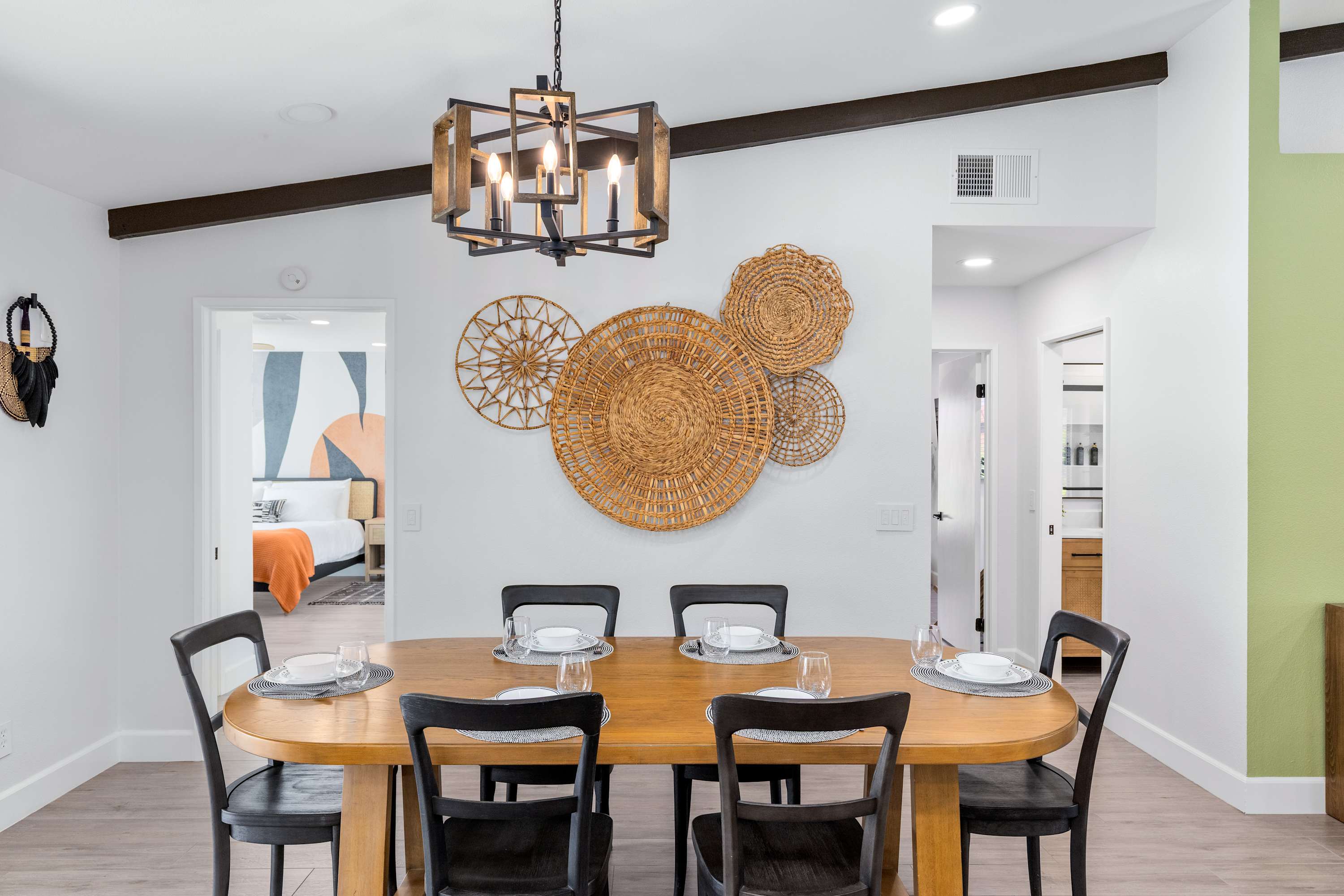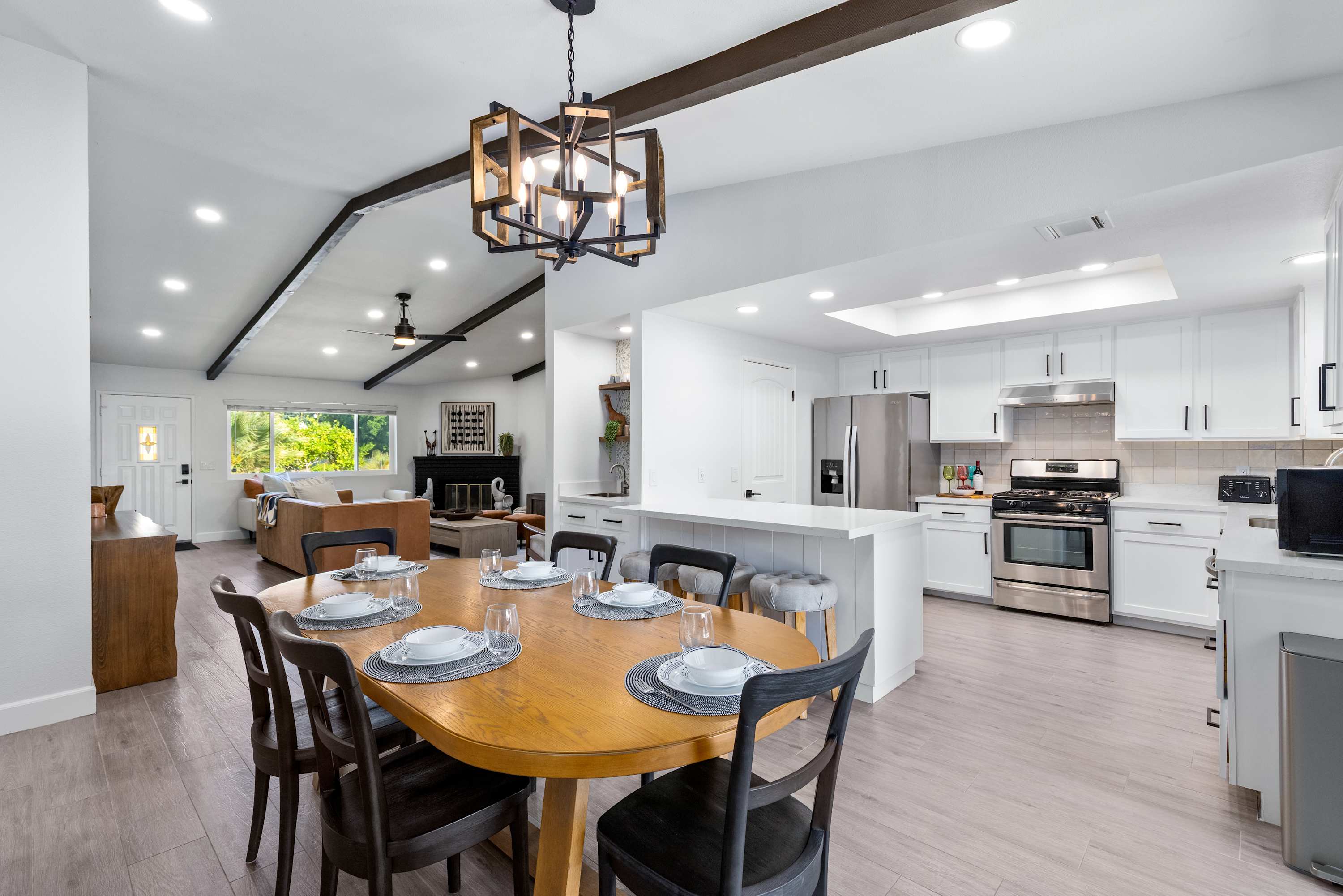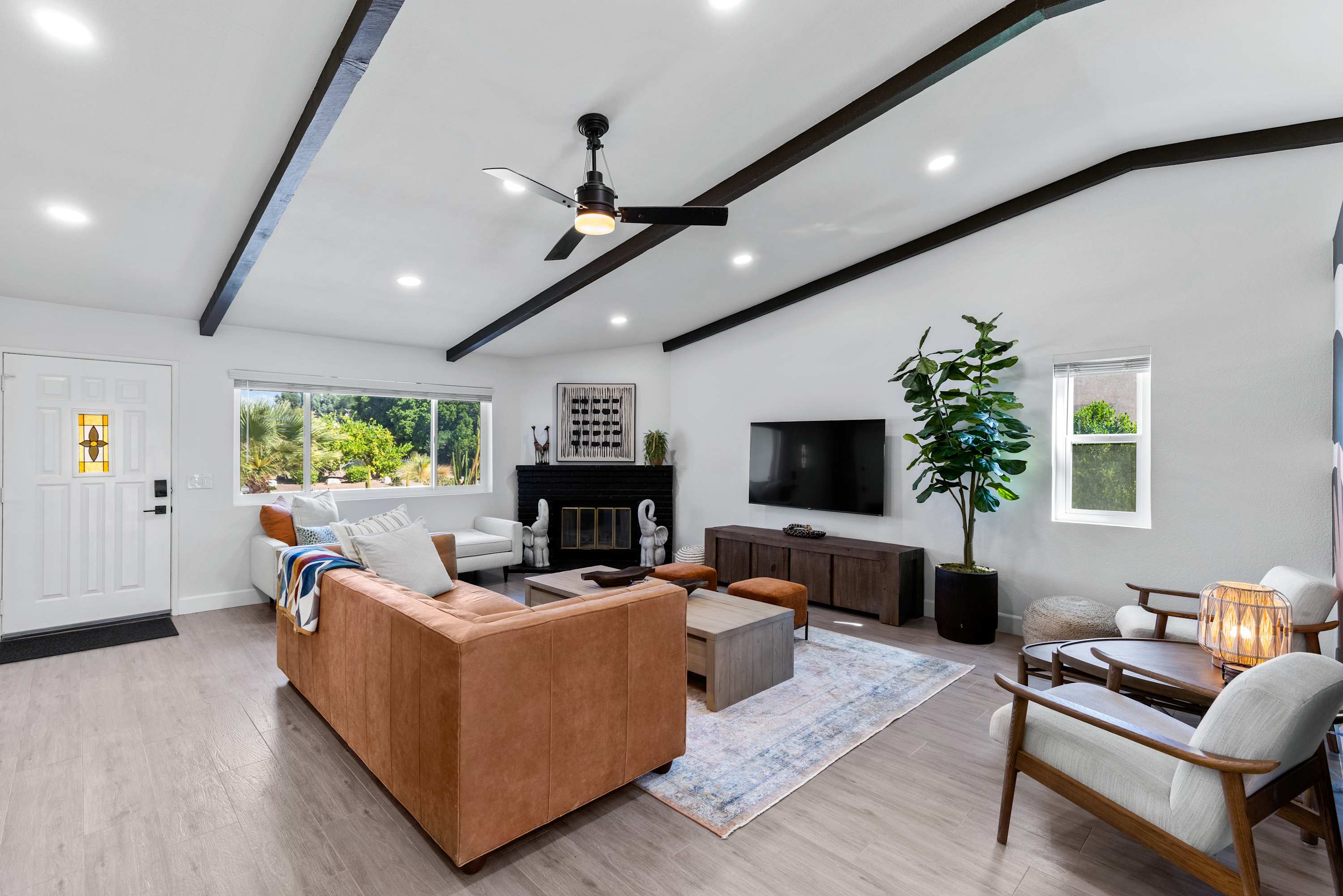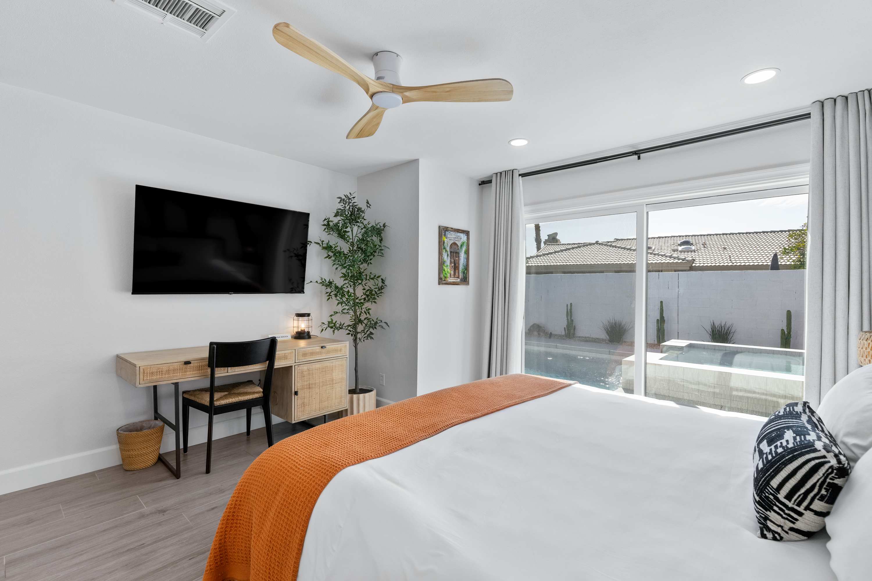 🛋 Living Room: Step into an ambiance like no other. With soaring beamed ceilings, vibrant Afrohemian wallpaper, and the soft glow of desert light, this space radiates warmth and style. Sink into the leather couch or daybed, gather by the fireplace, or share laughs over a favorite board game. The Smart TV welcomes you upon arrival and connects you to everything the desert offers — from in-home massages and private chefs to local adventures designed to elevate your stay. This is where comfort, culture, and connection meet.