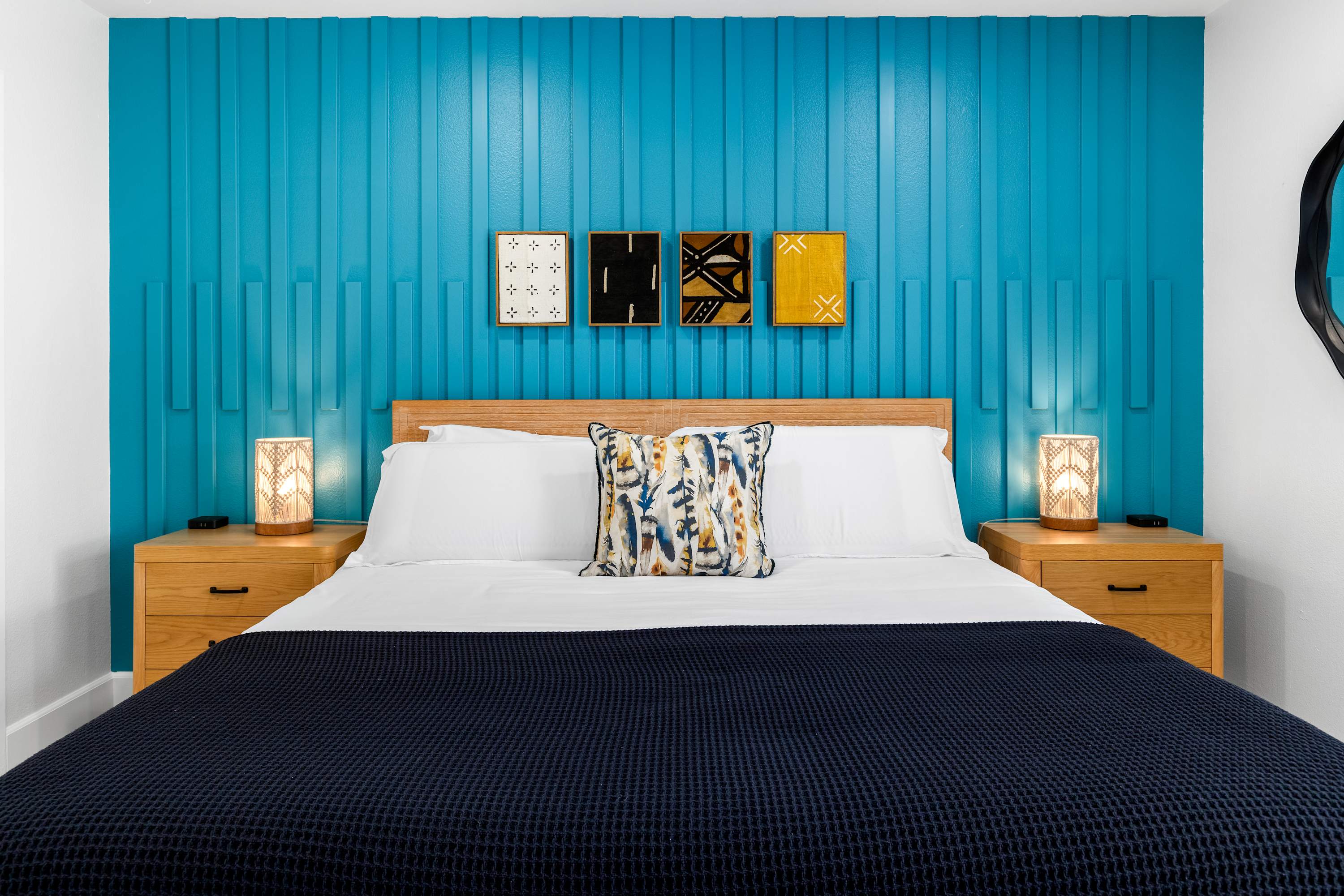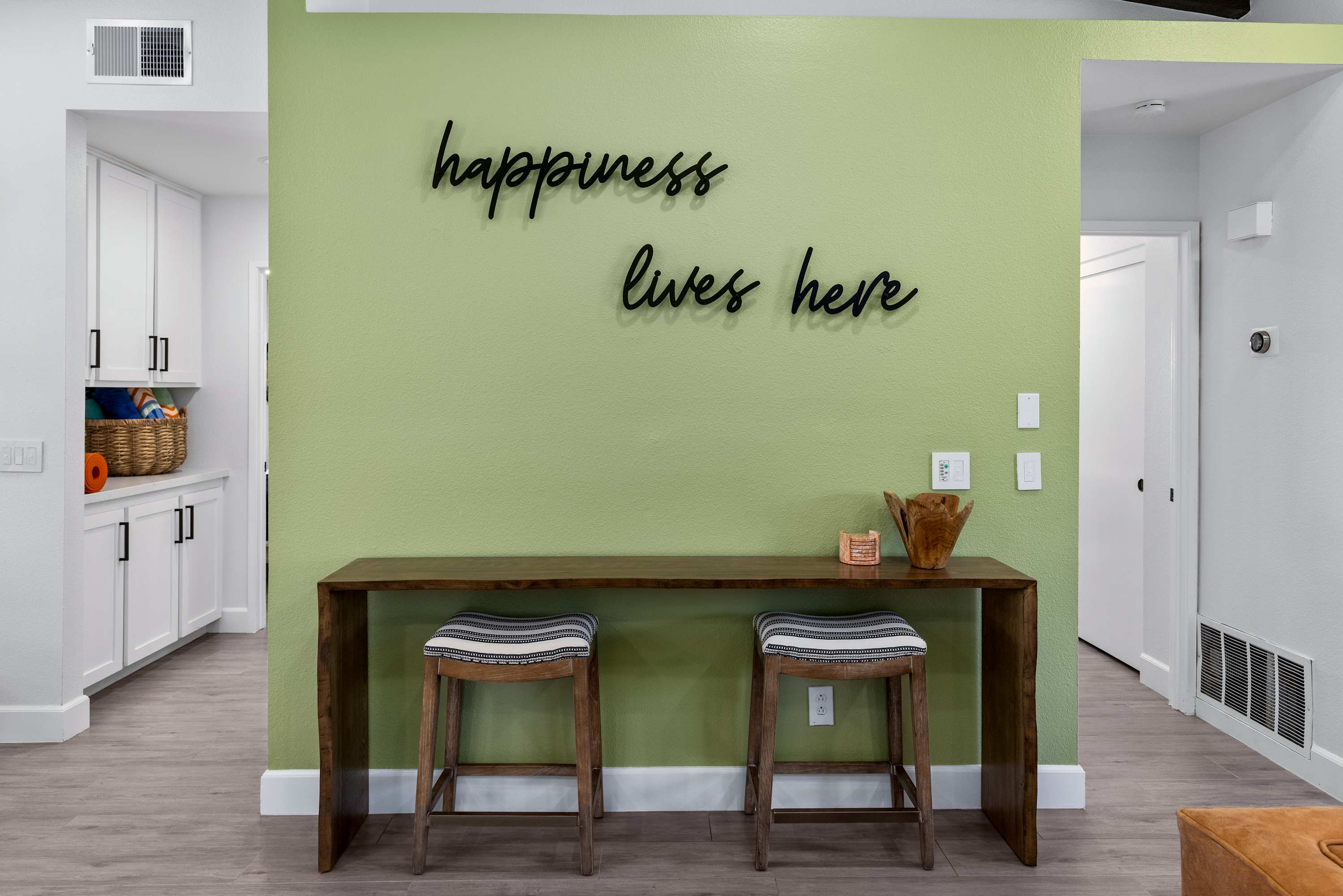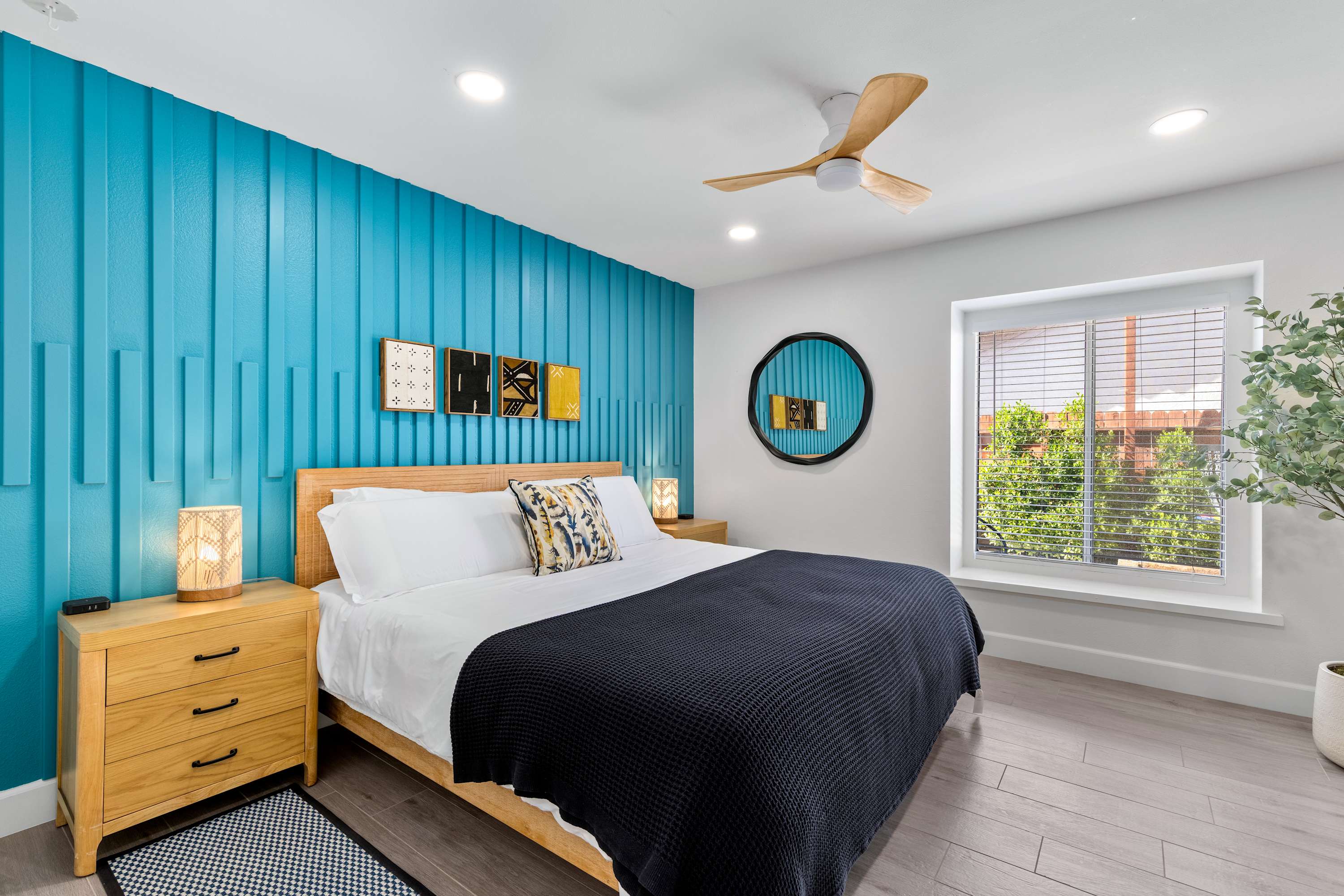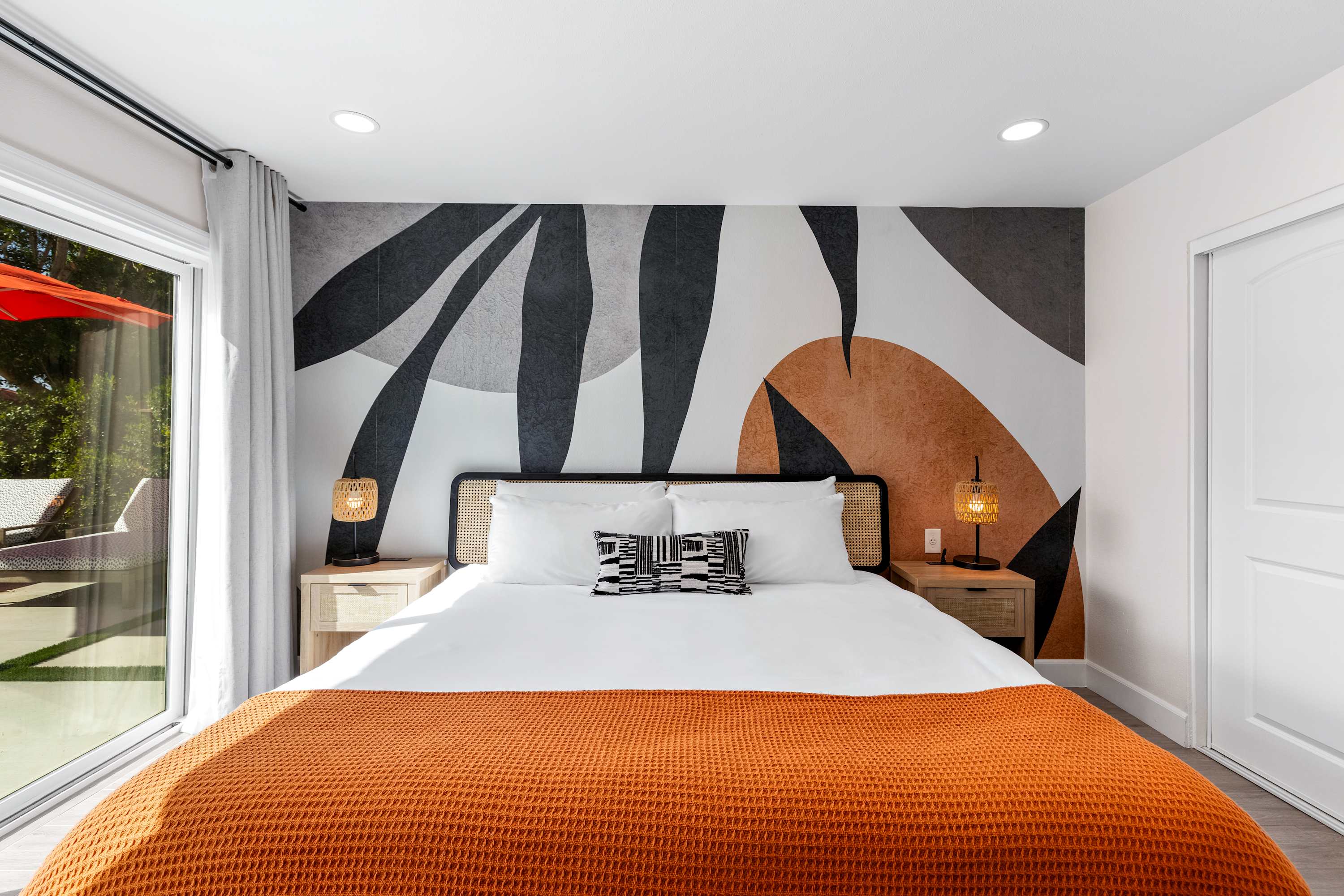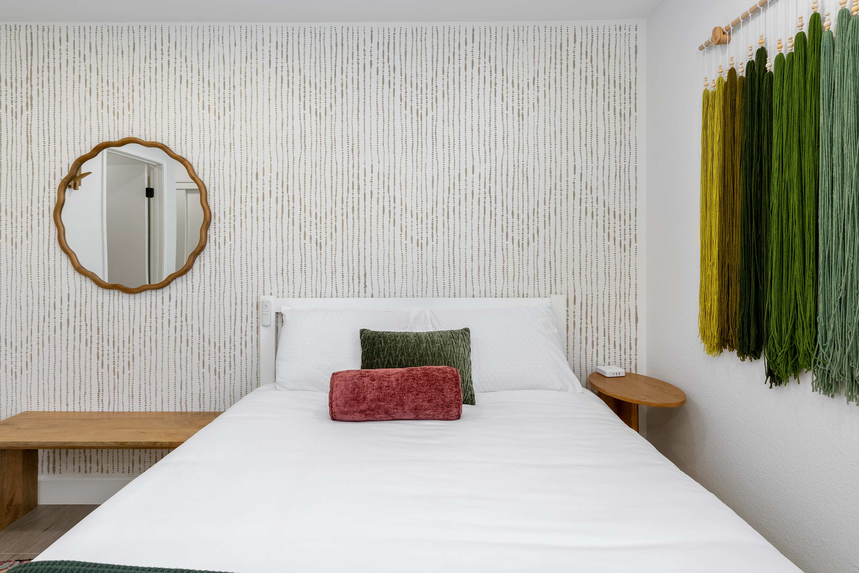 🛋 Living Room: Step into an ambiance like no other. With soaring beamed ceilings, vibrant Afrohemian wallpaper, and the soft glow of desert light, this space radiates warmth and style. Sink into the leather couch or daybed, gather by the fireplace, or share laughs over a favorite board game. The Smart TV welcomes you upon arrival and connects you to everything the desert offers — from in-home massages and private chefs to local adventures designed to elevate your stay. This is where comfort, culture, and connection meet.
