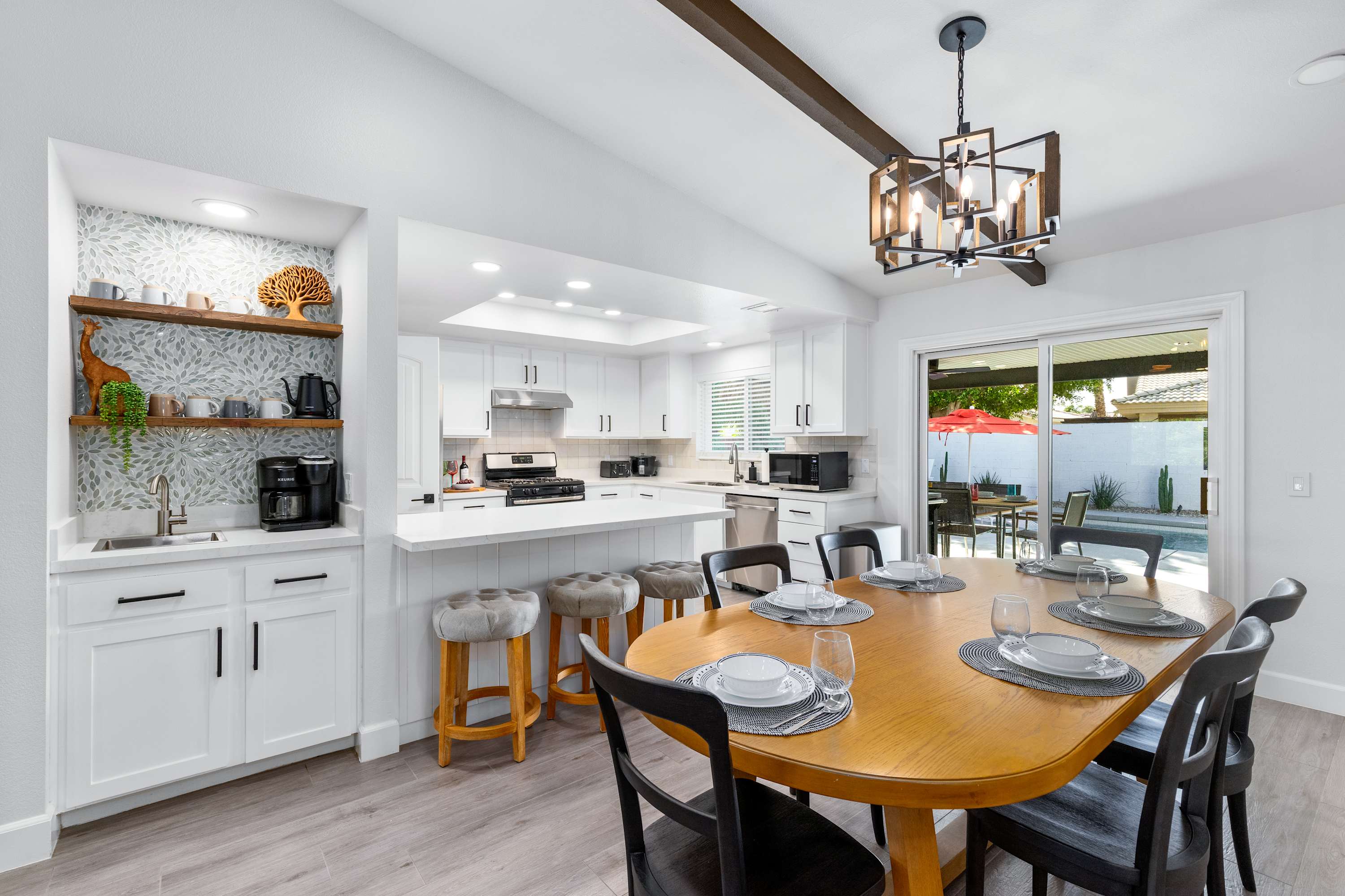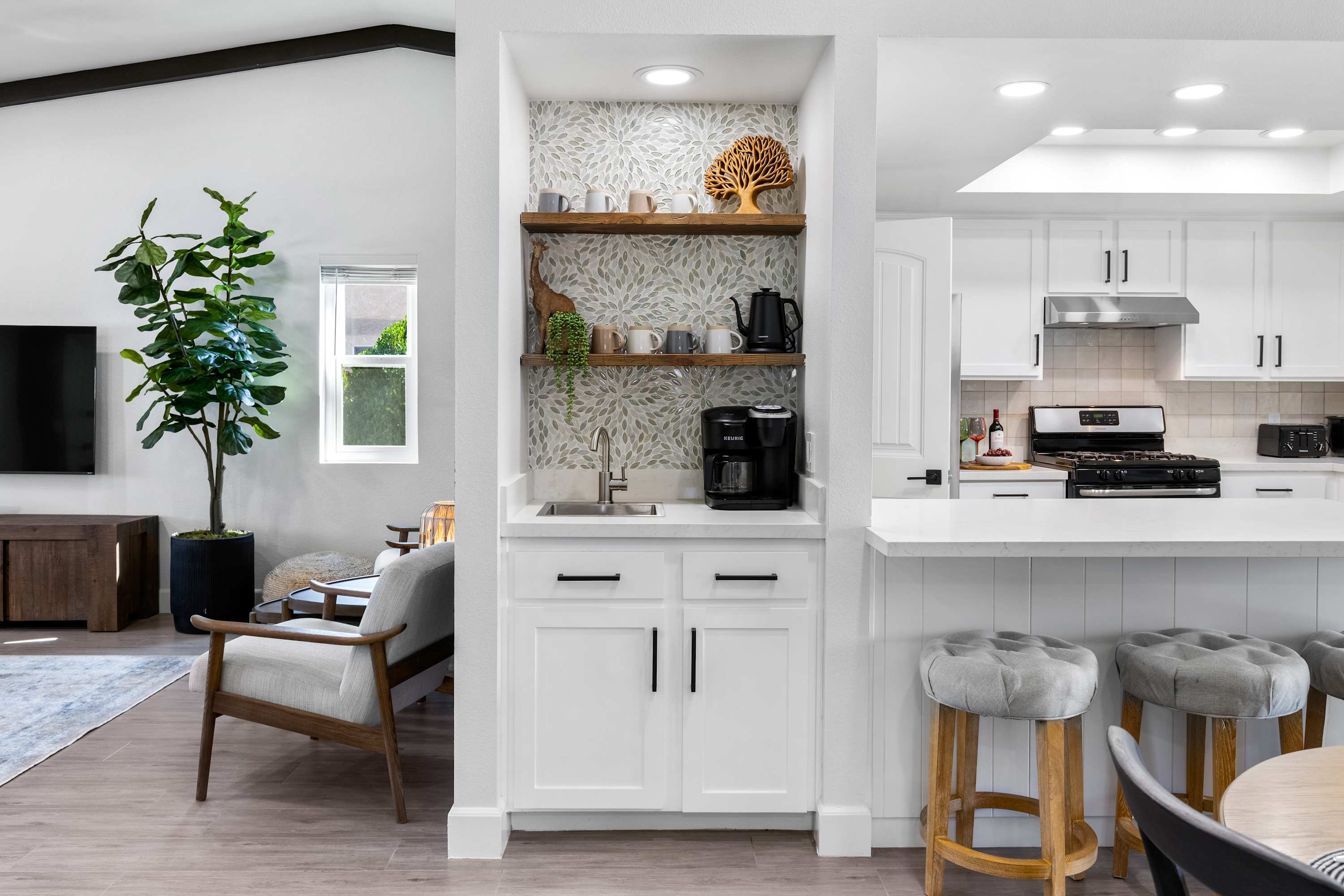☕ Coffee Nook – Kickstart your day in style at your own coffee sanctuary. Whether you prefer a quick Keurig cup or a slow-brewed drip coffee, we’ve got you covered. Heat water in the electric kettle, choose from coffee pods or locally roasted Palm Springs coffee, and pour into your favorite mug. Perfect for quiet mornings, scrolling through your favorite feed, or planning desert adventures — this little corner turns every sip into a moment to savor.