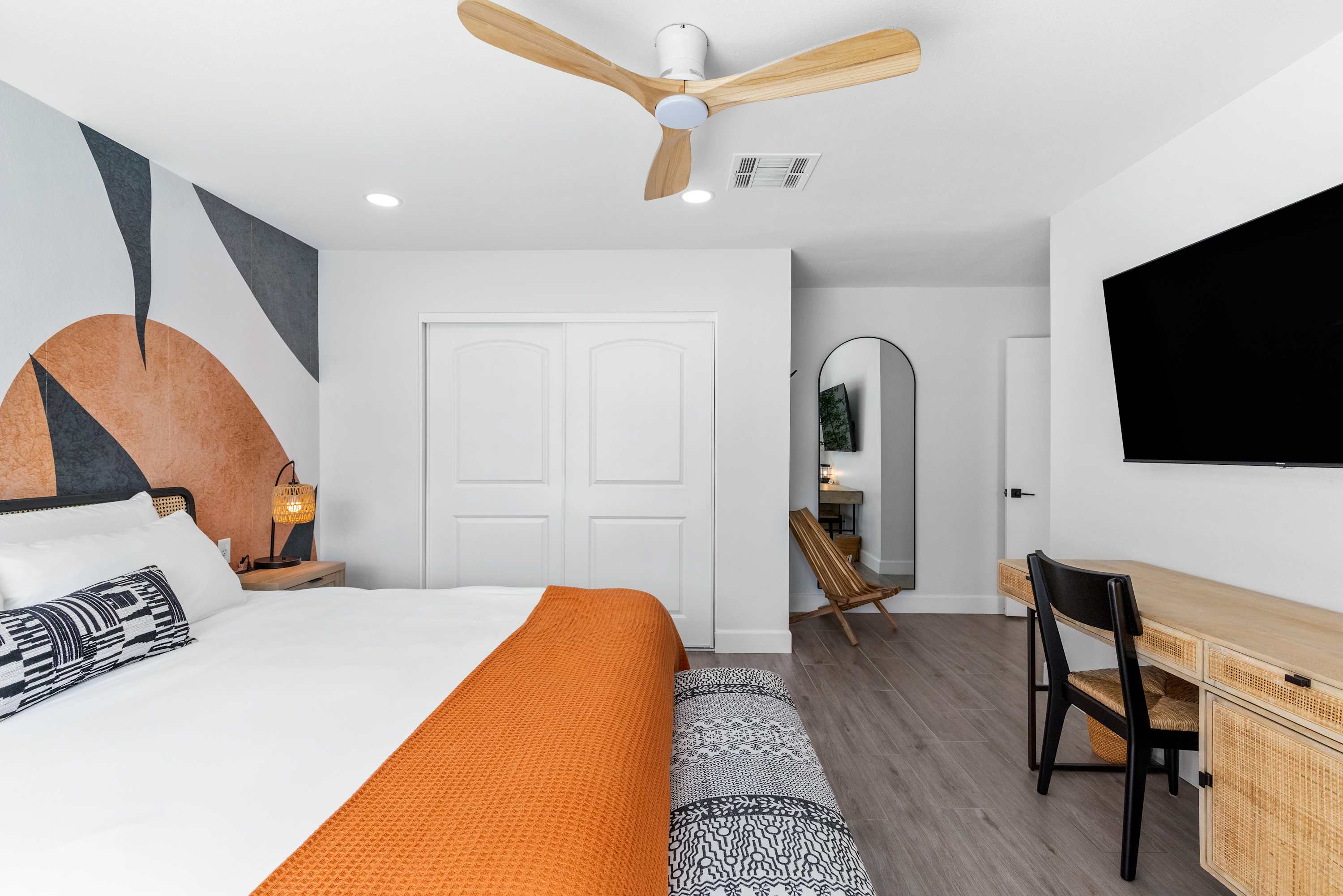 🌿 Primary Bedroom – The Retreat: Relax in comfort and style with a king bed, blackout curtains, and a spa-style ensuite bathroom. Enjoy a flat-screen Smart TV with phone mirroring and app access, plus a desk, chair, bench, and large closet for convenience. A twin air mattress is also available for added flexibility.