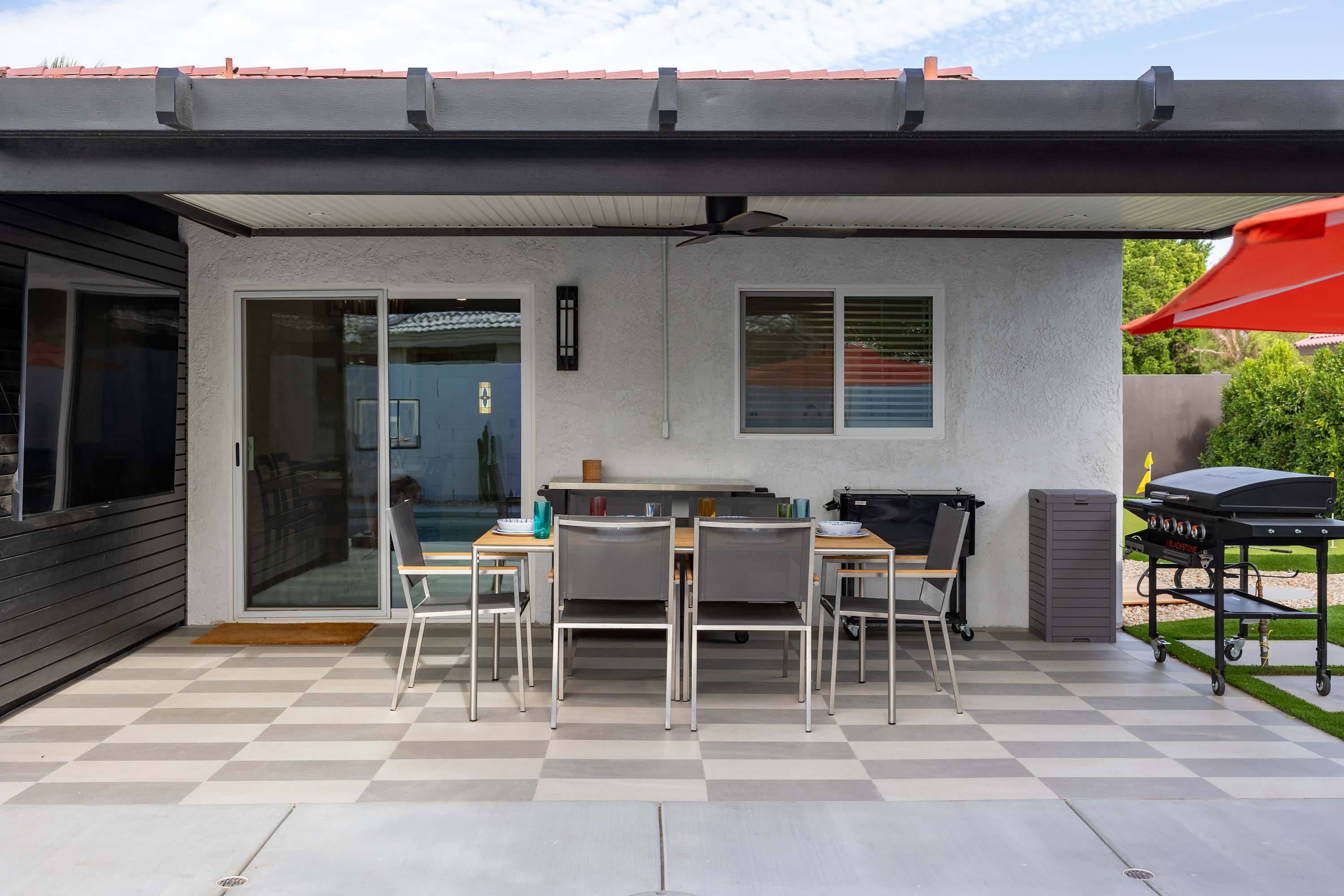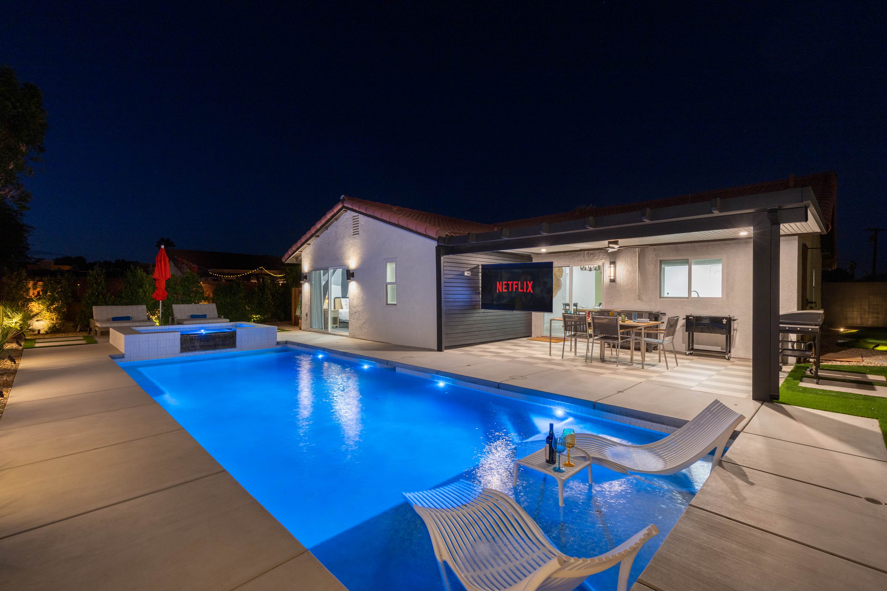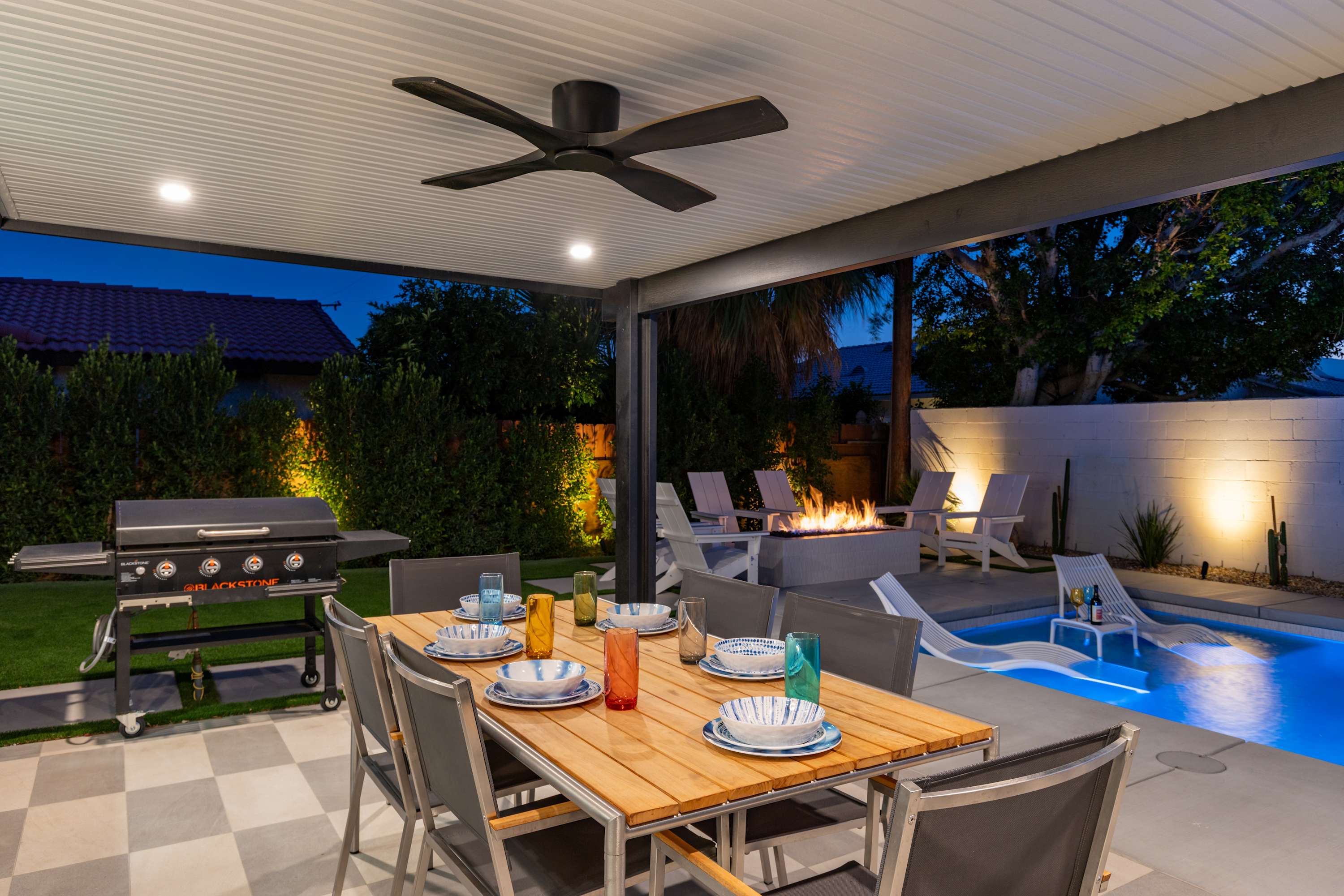 🍴 Blackstone Griddle & Outdoor Dining –Cook and dine beneath the desert sky at the 6-seat covered patio table. The built-in natural gas griddle makes outdoor cooking a breeze — no propane tanks to change, just instant heat and easy grilling whenever inspiration strikes.