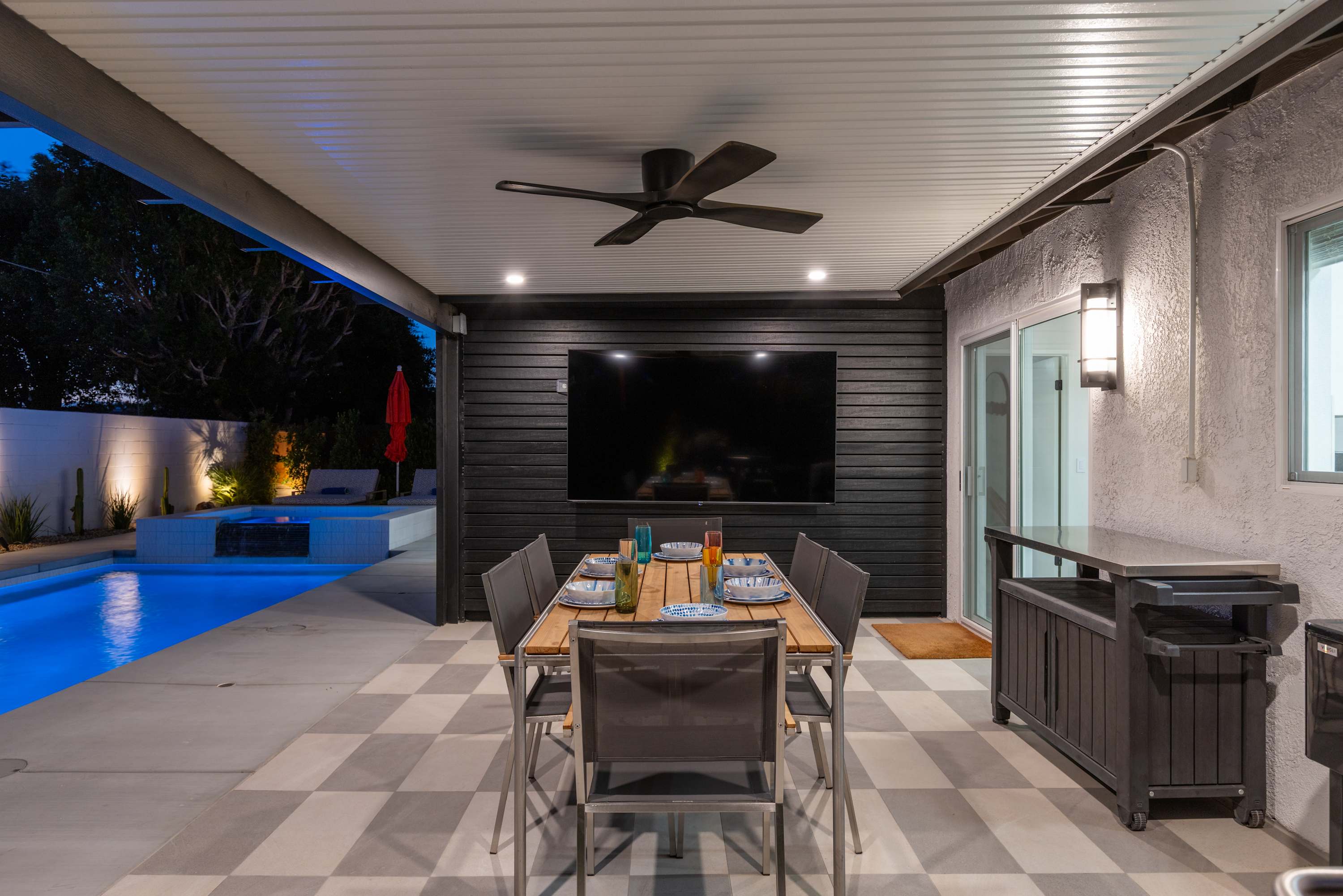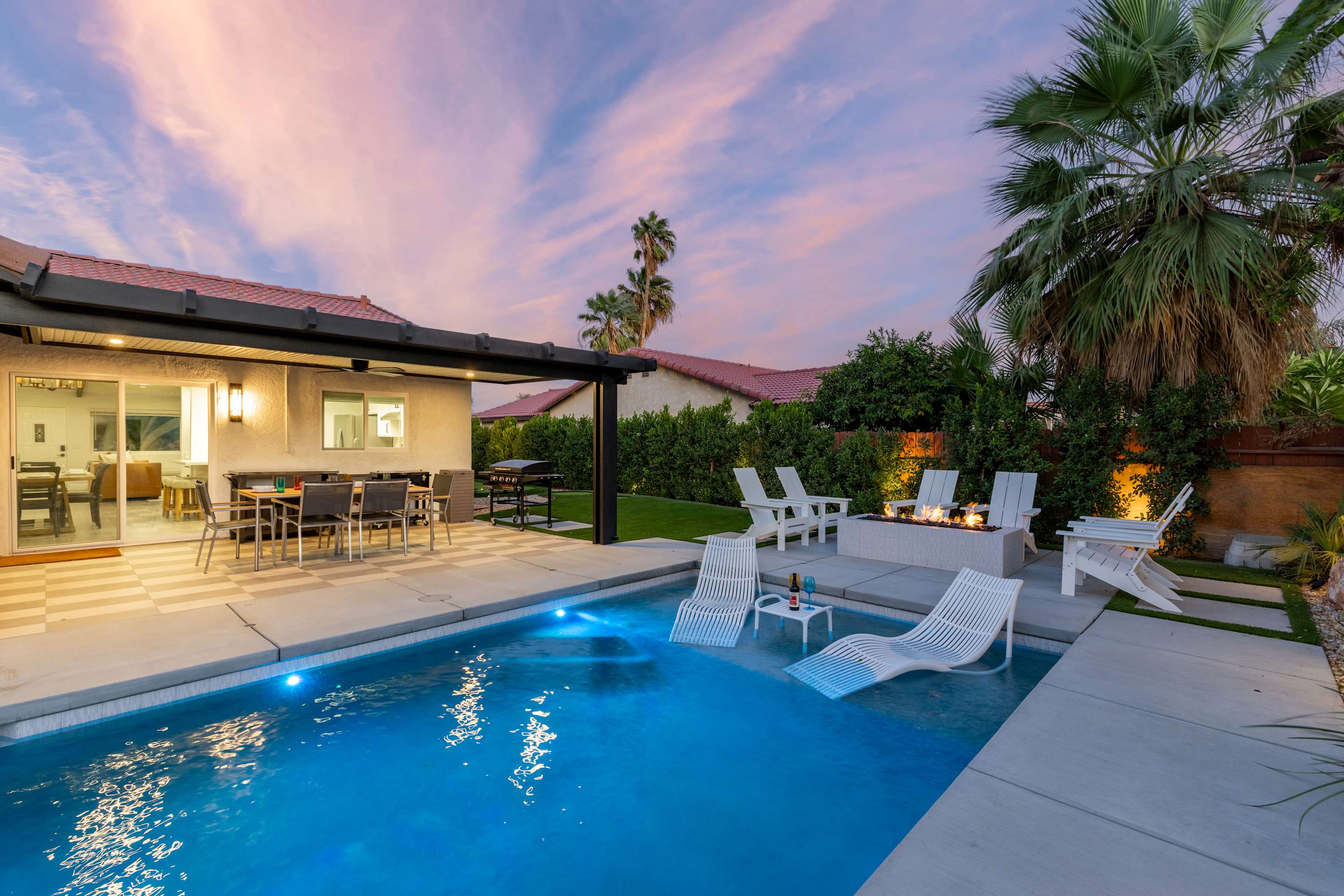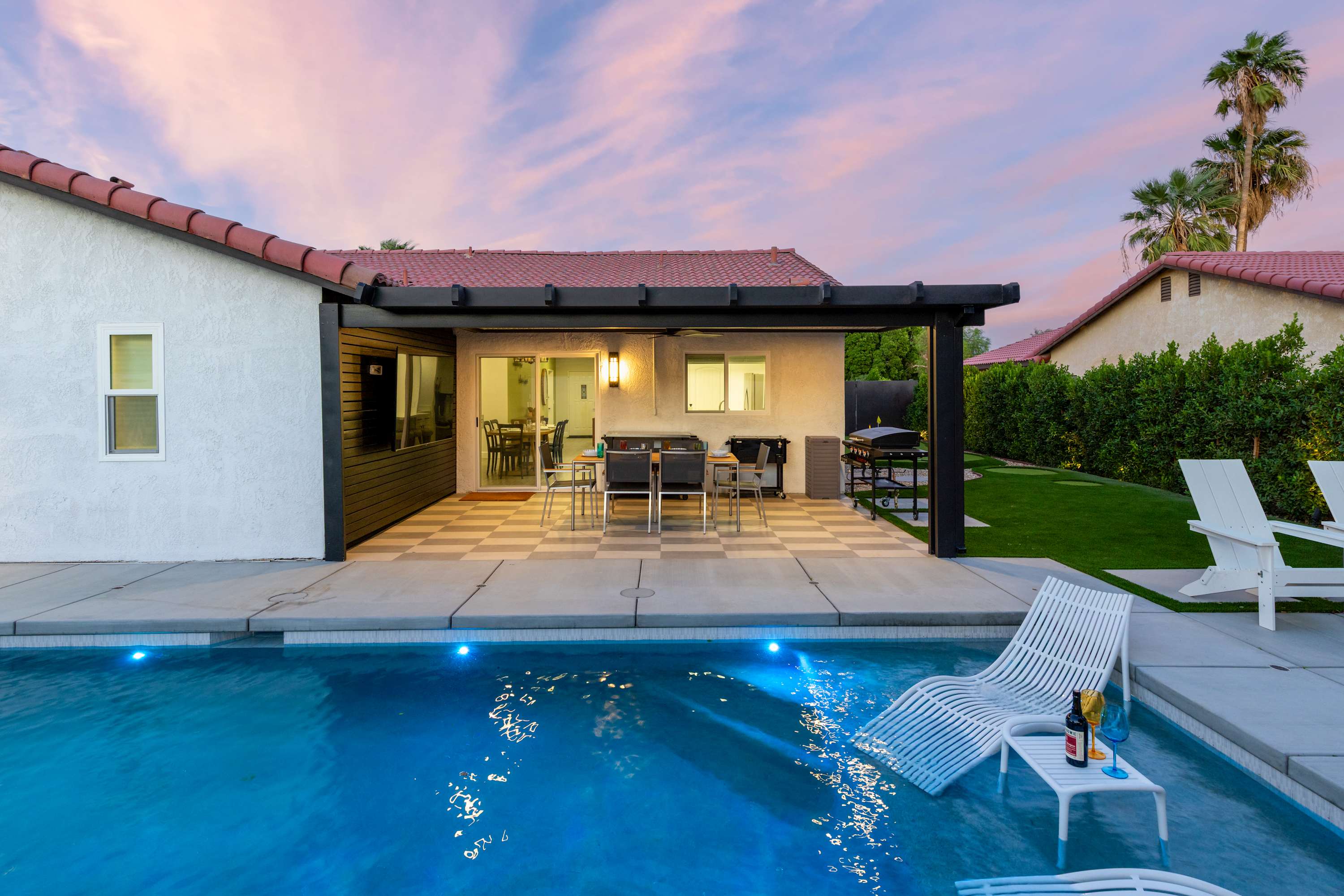 🍴 Blackstone Griddle & Outdoor Dining –Cook and dine beneath the desert sky at the 6-seat covered patio table. The built-in natural gas griddle makes outdoor cooking a breeze — no propane tanks to change, just instant heat and easy grilling whenever inspiration strikes.
