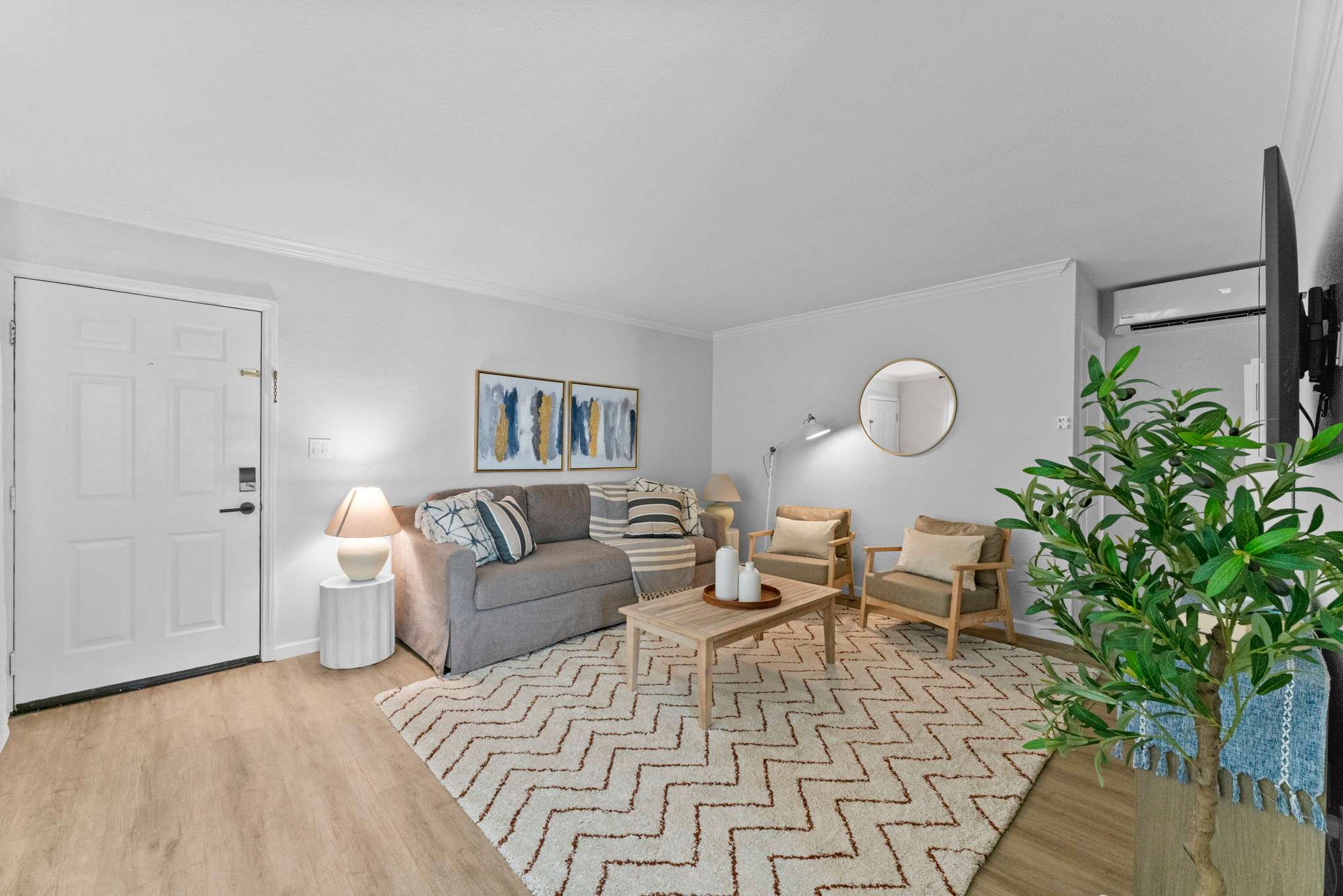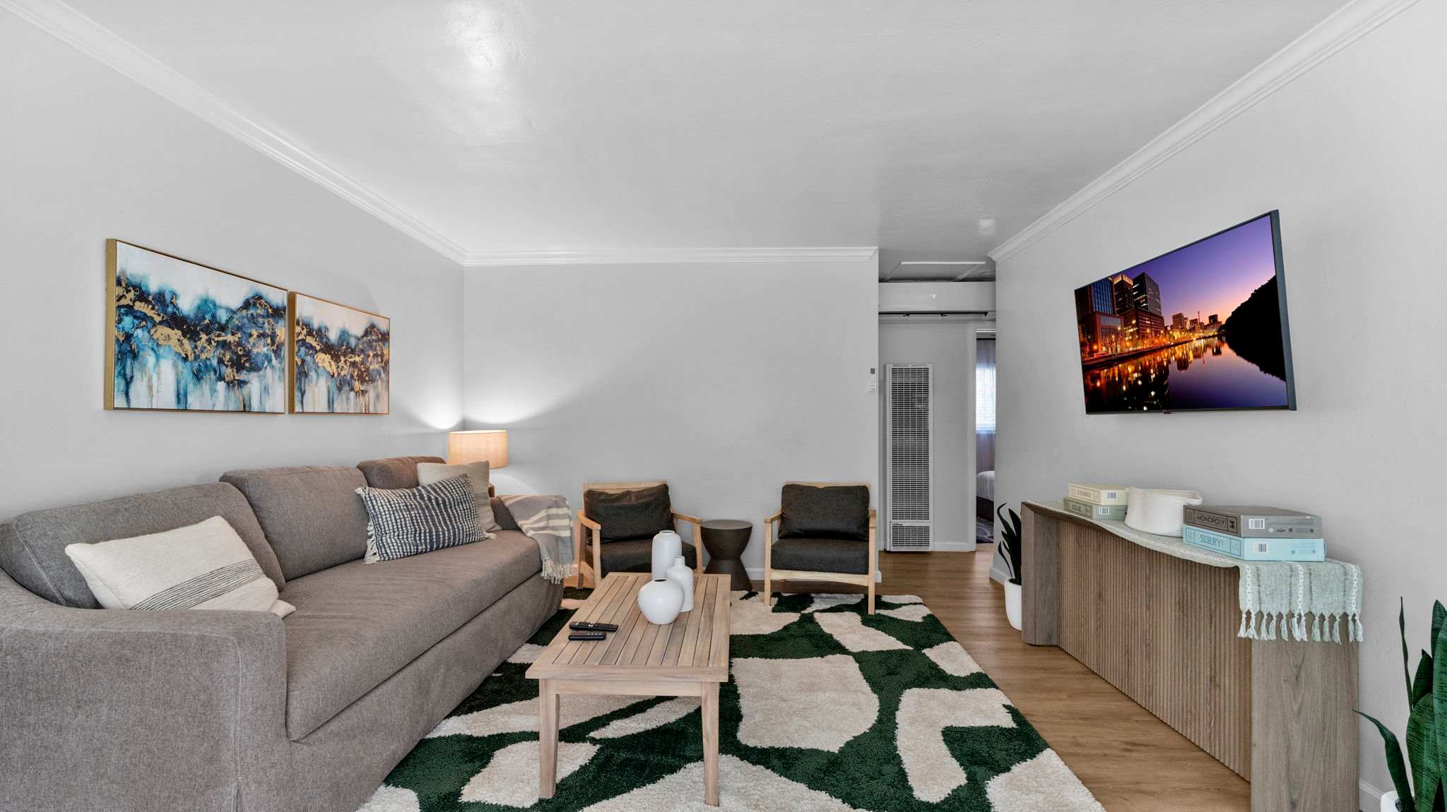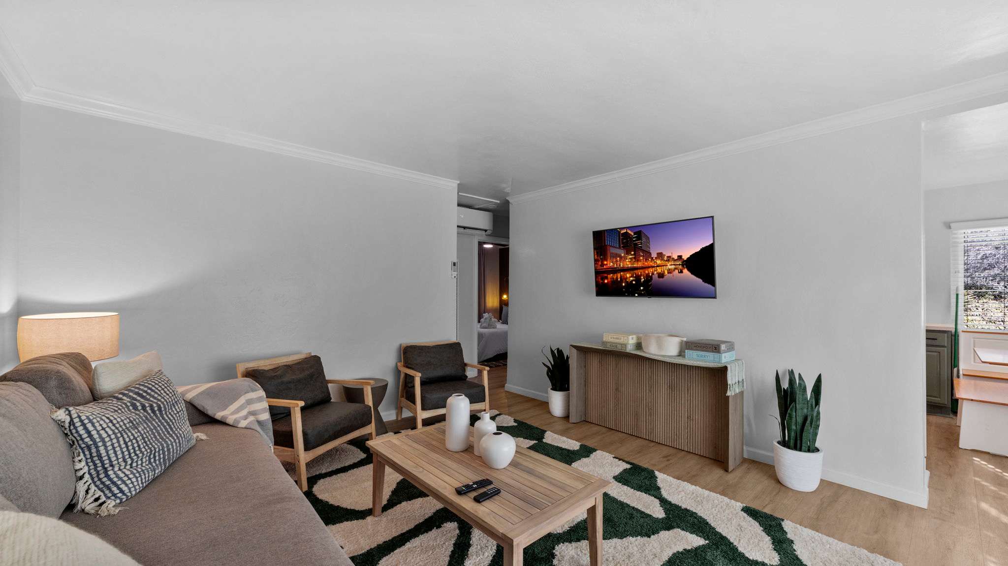 * Comfortable Living: Living area with a mini-split A/C unit and a Smart TV.